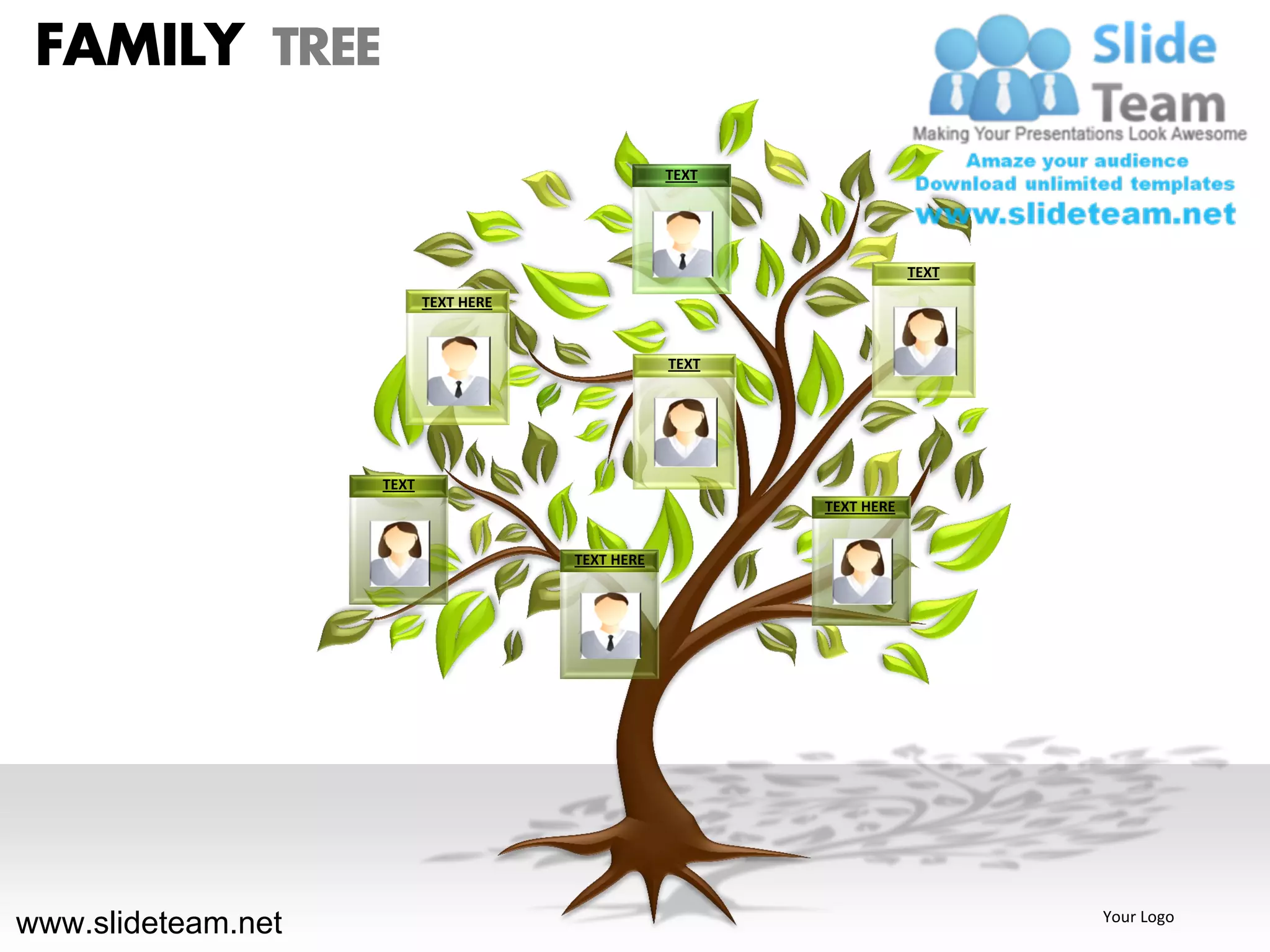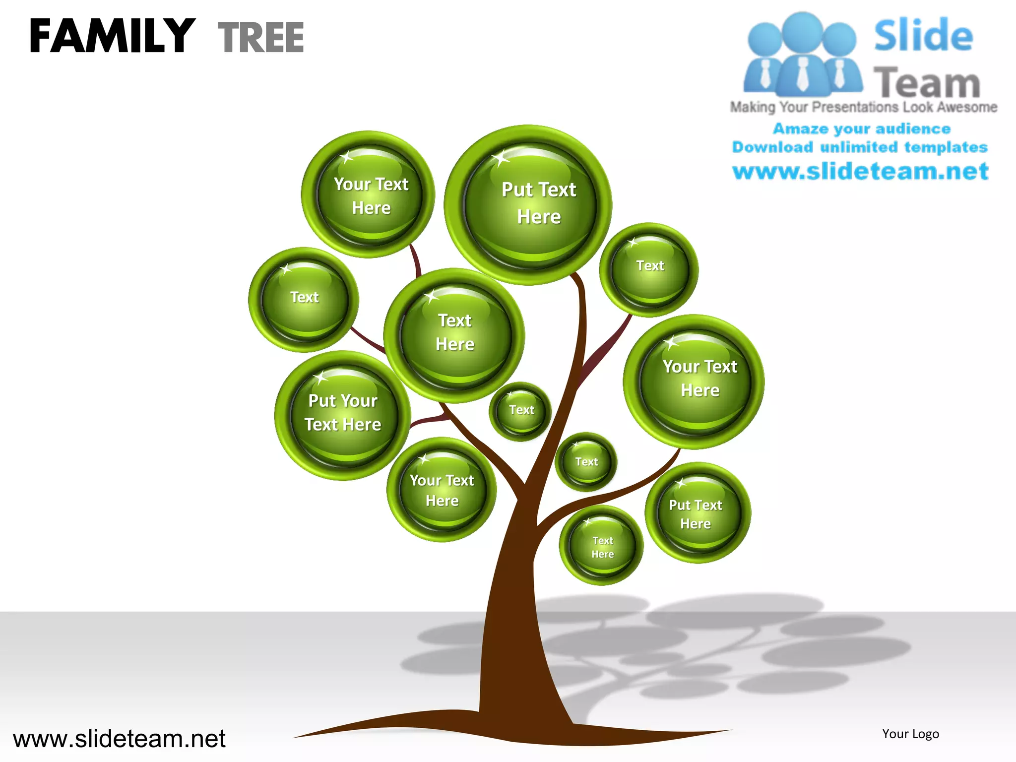 The document appears to be a template for creating a family tree, with placeholders for adding names and relationships. Text blocks are laid out with labels for family members, and lines connect the blocks presumably to represent family connections. The template includes many empty text blocks and lines that could be populated with specific family member names and details to build out a custom family tree.