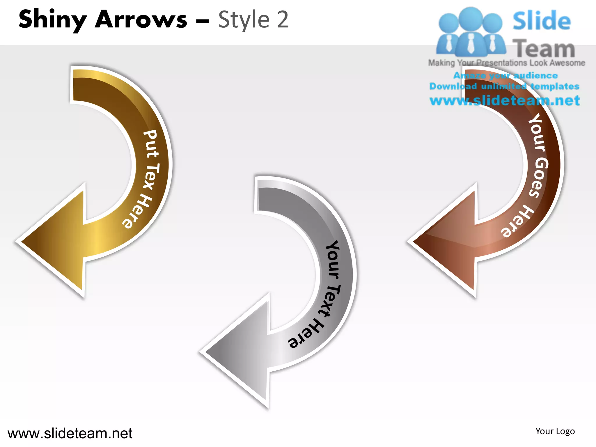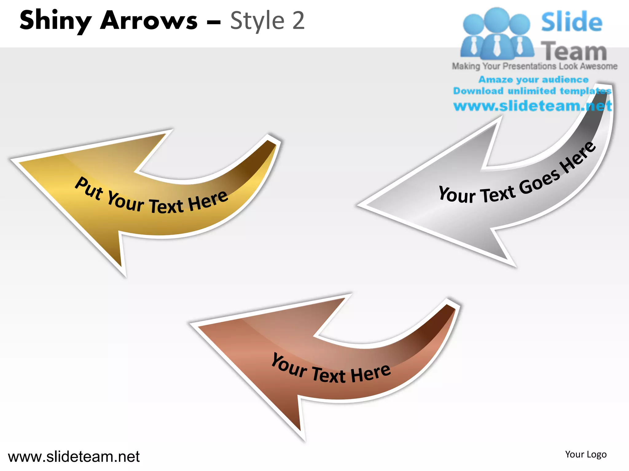 The document shows a template for presentation slides with shiny arrows and text boxes. It includes multiple pages with variations of arrows pointing to text boxes in different orientations and configurations. Instructions are provided at the bottom on how to customize the colors, ungroup objects, and edit the icons in PowerPoint for maximum flexibility. The template offers reusable slides with arrows to guide the audience between text elements on a presentation.