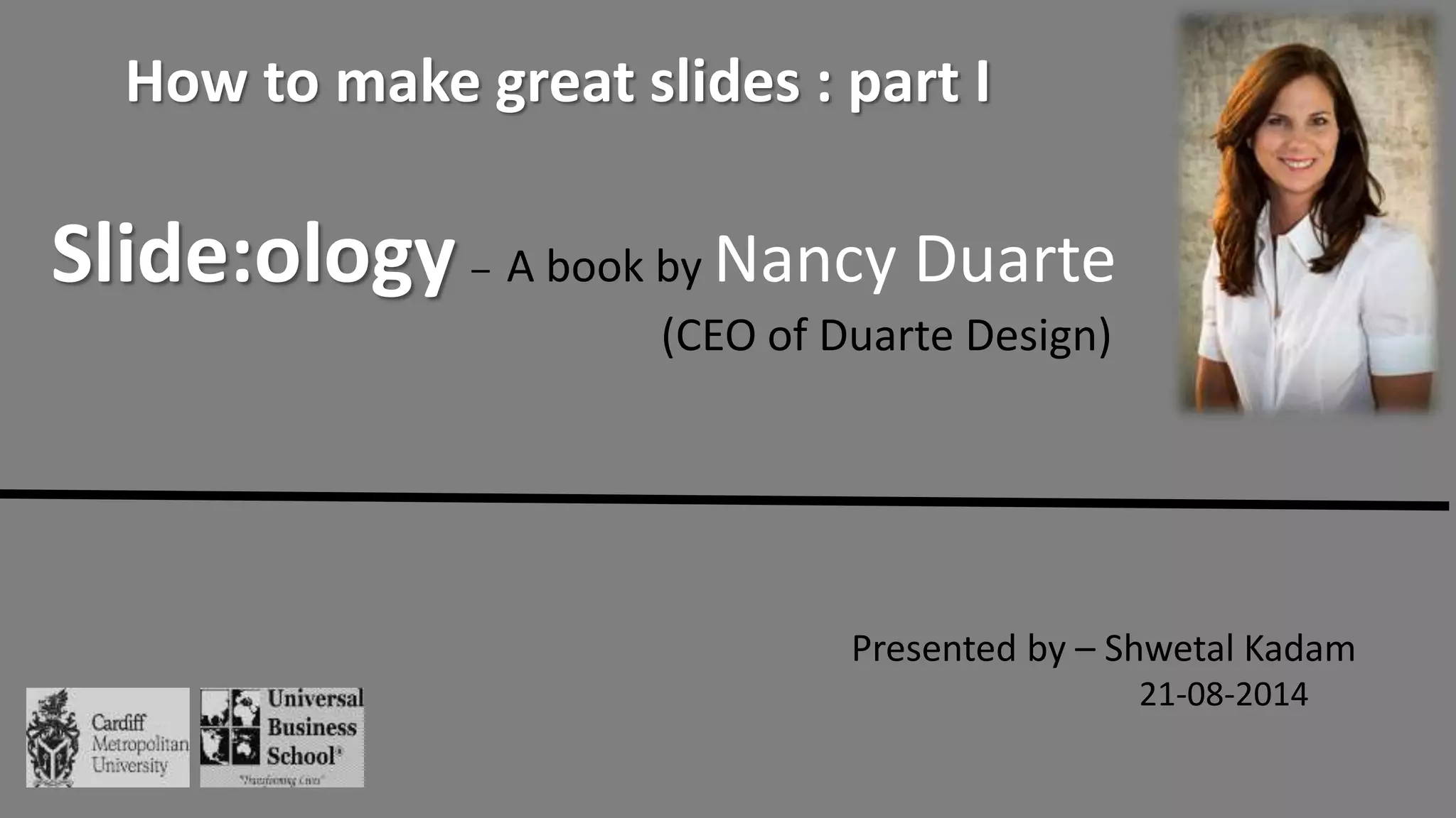 The document discusses key principles from Nancy Duarte's book 'slide:ology' on creating effective presentations. It emphasizes the importance of simplicity, contrast, and focusing on single concepts for each slide, suggesting tools like brainstorming and sketches to generate ideas. The goal is to make slides engaging and quick to understand, akin to a visual communication approach.