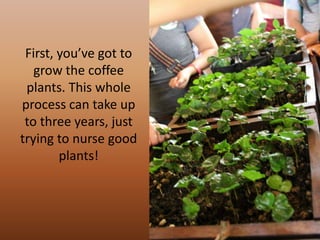 The document provides a step-by-step guide on how to make coffee, starting from growing the coffee plants which takes about three years. It details the process from picking coffee cherries, fermenting them to reveal the beans, and properly handling and grinding the beans for brewing. Finally, it encourages the reader to enjoy their freshly made coffee.