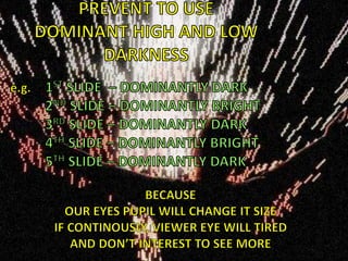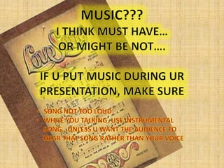 The document provides tips for creating effective presentations. It advises to avoid plain white backgrounds and distracting backgrounds that take attention away from the presentation content. Graphics and animations should be used sparingly and kept simple so the audience understands easily. Text colors and fonts should be carefully chosen so the information is clear and readable for the audience. Presenters are reminded to praise their audience to engage them.
