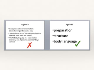 To make a good presentation, keep it simple with a large font size and use color to emphasize key points. Practice your presentation and be prepared to skip unnecessary slides if you run out of time. Visuals like pictures are more effective than just words, so include images when possible.