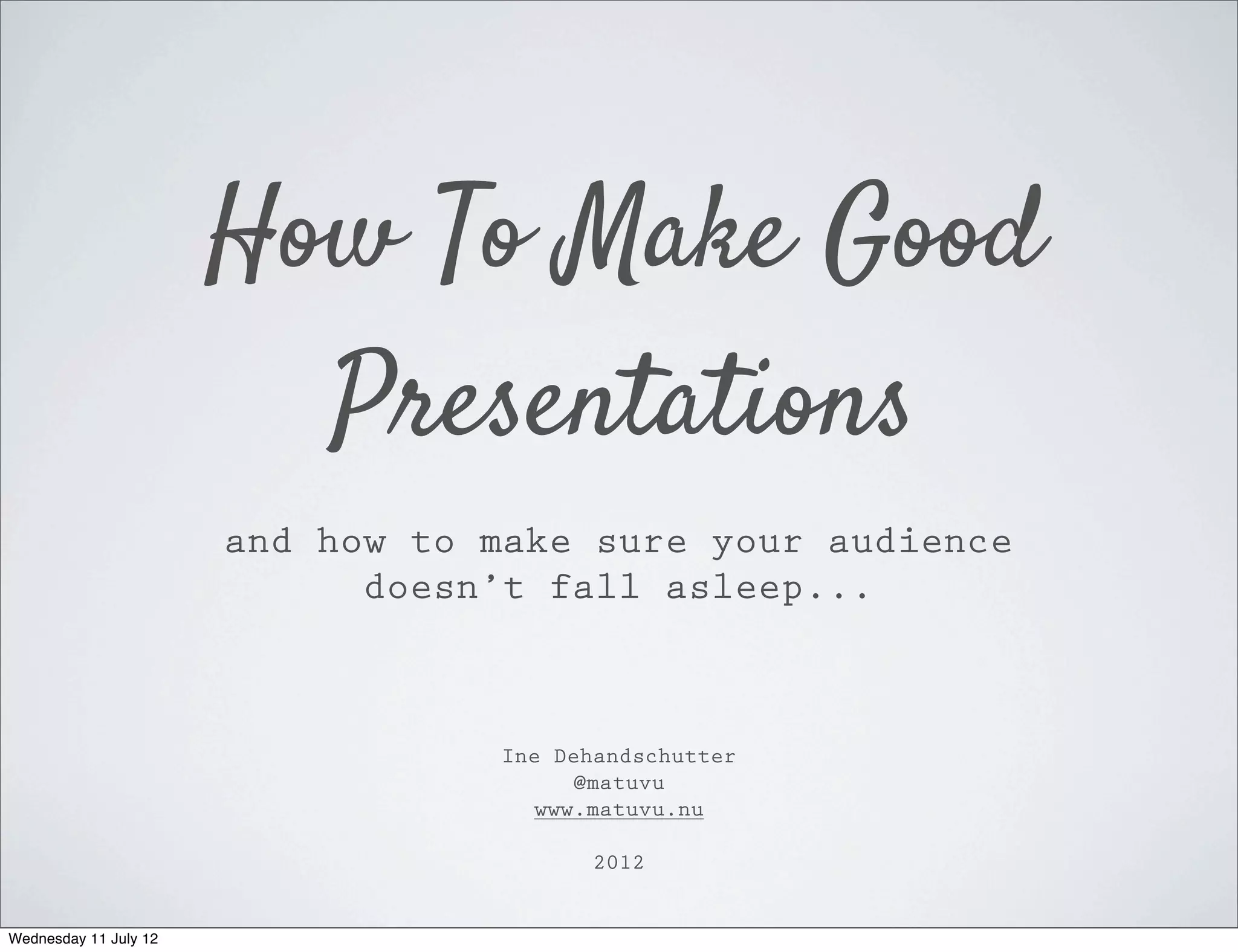 This document provides tips for creating effective presentations by emphasizing audience engagement, clear content structure, and design principles. Key advice includes knowing your audience, simplifying slides to focus on single ideas, crafting a compelling narrative with humor, and using strong visual designs while avoiding excessive text and animations. Additionally, it stresses the importance of sharing information and maintaining a professional image during presentations.
