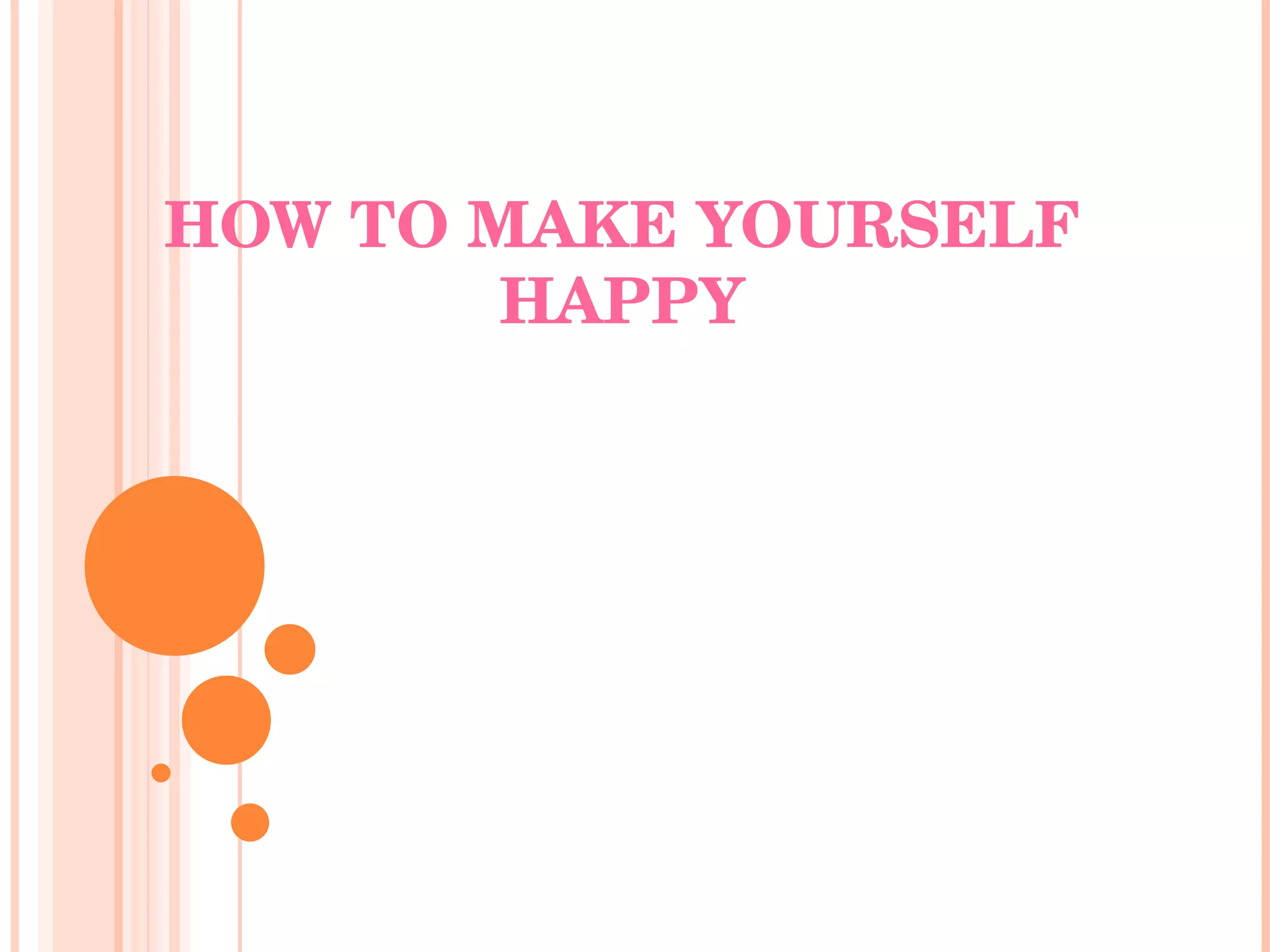 The document provides 18 tips for making yourself happy, including having goals and targets, smiling, sharing happiness with others, helping others, keeping a childlike sense of wonder, getting along with different people, maintaining a sense of humor, staying calm during surprises, forgiving others, having good friends, working as part of a team, enjoying family time, being confident, respecting others, indulging yourself sometimes, working from time to time, being brave and courageous, and not being obsessed with money.