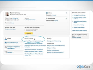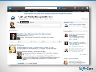 The document provides a comprehensive guide for law firms on how to effectively utilize LinkedIn to enhance their practice. It emphasizes the importance of tailoring profiles to target audiences, using strategic keywords, and engaging with connections and groups to build a professional network. Additionally, it covers best practices for maintaining a polished profile while being aware of ethical considerations related to attorney advertising on social media.