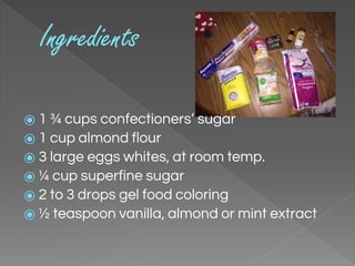 This document provides a 10-step recipe for making macarons with detailed instructions. It involves mixing almond flour and powdered sugar, beating egg whites into a meringue, folding the dry ingredients into the wet to form a batter, piping circles onto a baking sheet, and baking. Various fillings are also described such as raspberry, white chocolate mint, blueberry cheesecake, lavender honey, and pineapple.
