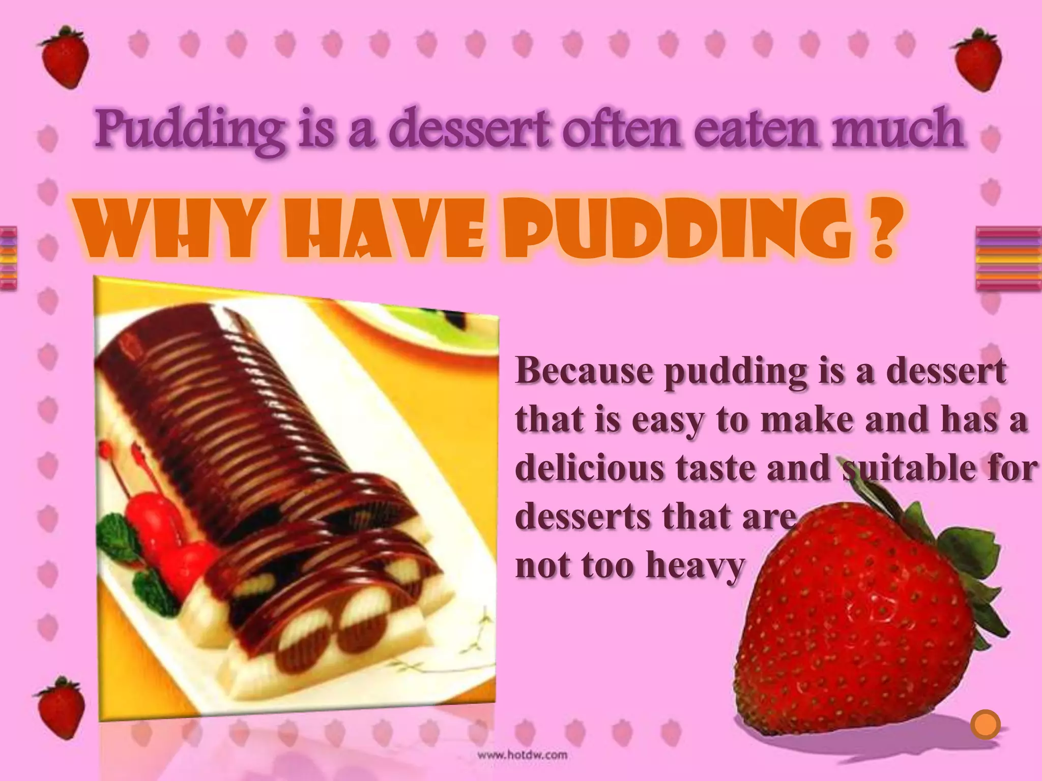 Pudding is an easy to make dessert that has a delicious taste and is not too heavy, making it suitable for dessert. To make pudding, powdered jelly, sugar, milk powder and water are mixed in a pan and heated while stirring until boiling. The mixture is then poured into molds and cooled in the freezer for an hour before being served, optionally with whipped cream.