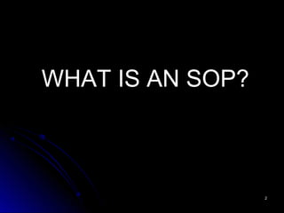 The document outlines the purpose and importance of standard operating procedures (SOPs), detailing their role in ensuring safety, regulatory compliance, and consistent training. It explains various formats for SOPs, the process of writing them, and the necessary components such as purpose, scope, and responsibilities. Additionally, it emphasizes the regulatory requirements associated with SOPs and provides guidelines for creating effective SOPs within organizations.