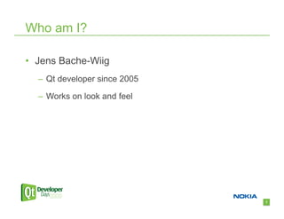 The document outlines best practices for developing cross-platform applications using Qt, covering introduction to styles, style sheets, dialogs, and platform-specific tips. It emphasizes the importance of adhering to platform guidelines, using custom styles cautiously, and managing state and user notifications appropriately. Specific insights on handling dialogs, styling elements, and ensuring consistent user experience across different operating systems are also provided.