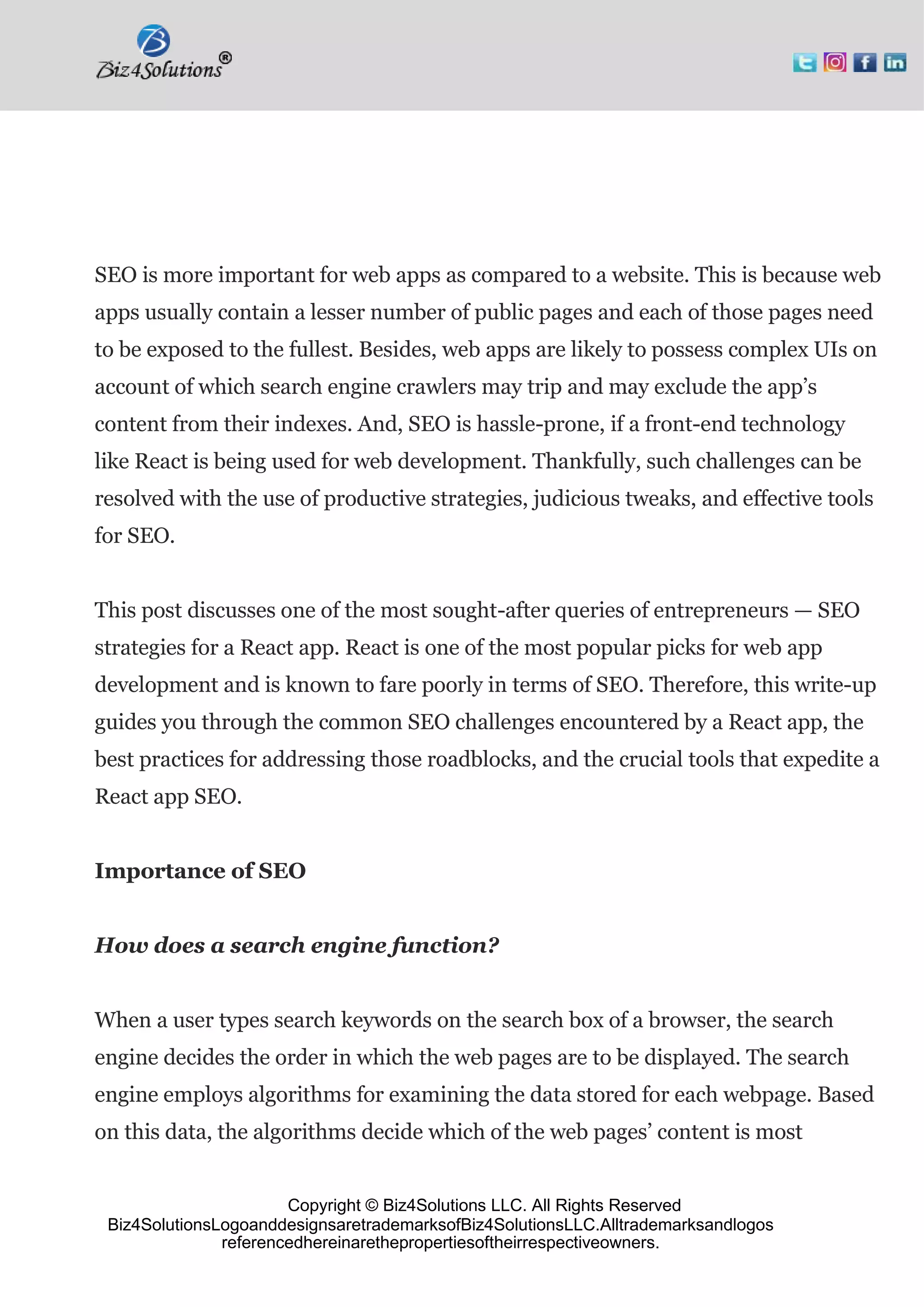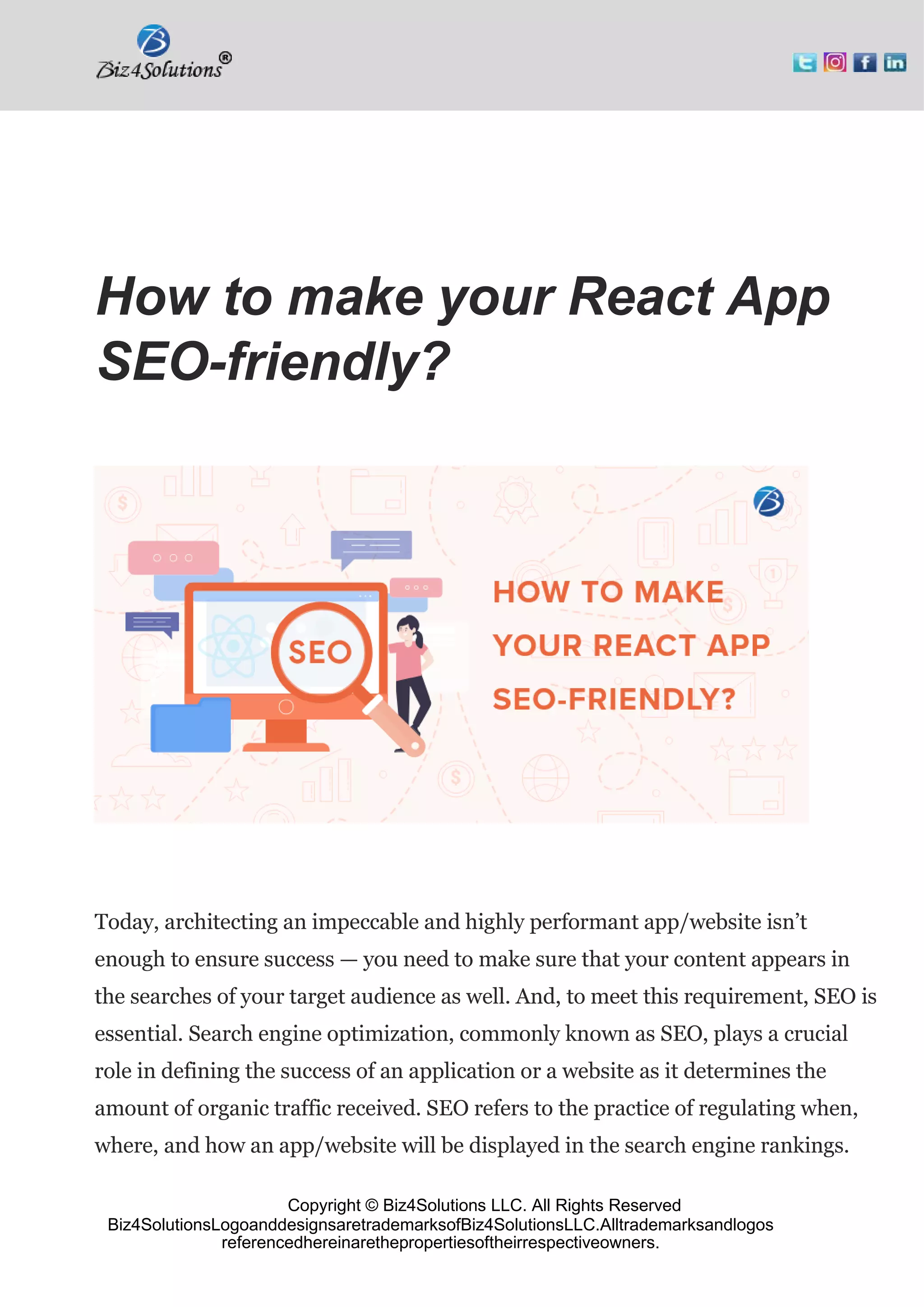 This document discusses strategies for making React apps SEO-friendly. It begins by outlining some common SEO challenges of React apps, such as single page apps not allowing full indexing and JavaScript pages potentially not being crawled. It then provides recommendations like using isomorphic React to render content on both the client- and server-sides, prerendering, and server-side rendering. Finally, it introduces some tools that can help, such as React Helmet for managing metadata and React Snap for pre-rendering apps into static HTML.