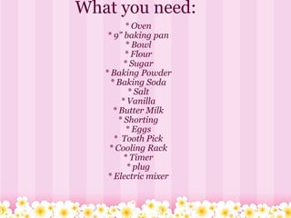 To make a cake, you need to gather supplies like a bowl, flour, sugar, baking powder, milk, shortening, eggs, and a baking pan. You combine the dry ingredients, then add wet ingredients like milk and shortening and mix. Pour the batter into the greased pan and bake at 350 degrees for 30-35 minutes until a toothpick inserted comes out clean. Allow the cake to cool before cutting into pieces and serving.