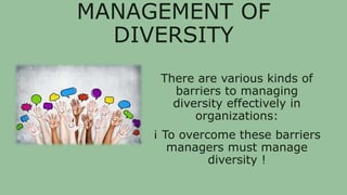This document outlines 11 steps to effectively manage diversity in organizations. It begins by acknowledging barriers to managing diversity and the need for managers to overcome them. The steps include securing top management commitment, increasing accuracy of perceptions and diversity awareness/skills, encouraging flexibility, closely evaluating employees, considering representation, empowering employees to challenge discrimination, rewarding effective management of diversity, and providing ongoing diversity training that includes mentoring. The tips section advises new managers to reflect on potential biases, ensure diversity training, find flexible solutions, communicate zero tolerance for discrimination, and facilitate mentoring.