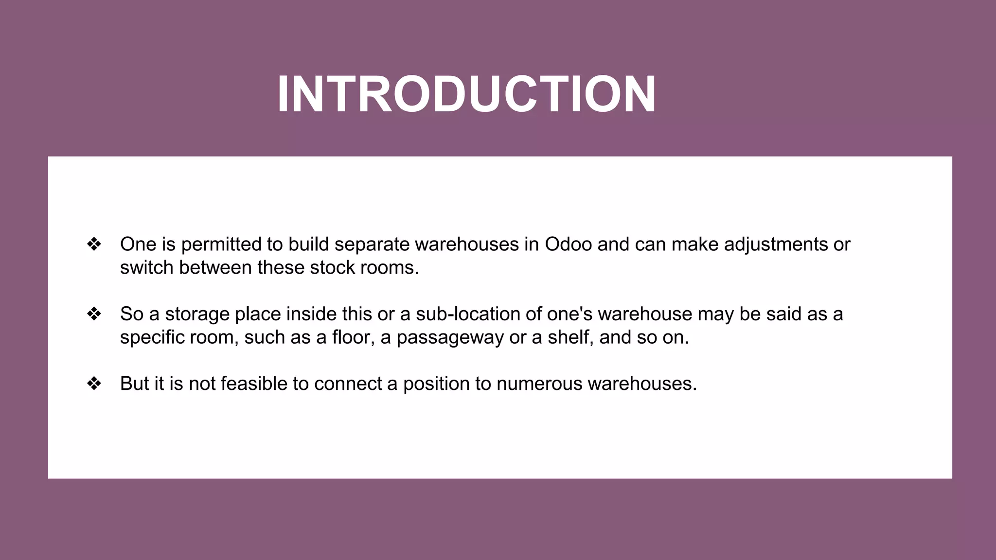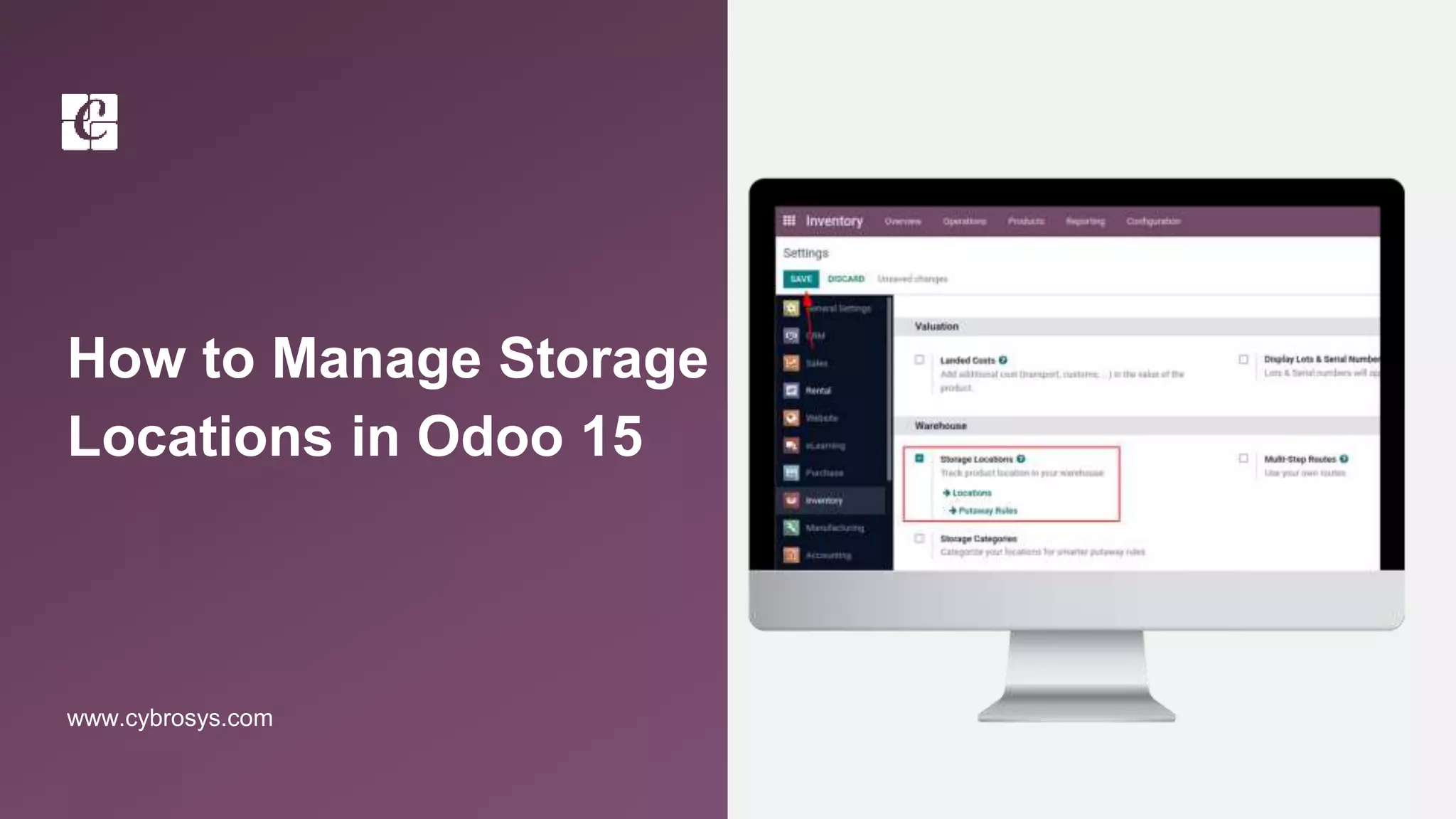 This document discusses how to manage storage locations in Odoo 15. It explains that storage locations allow dividing warehouses into specific rooms, floors, shelves, etc. and outlines the steps to enable and configure storage locations. These include enabling storage locations in the inventory settings, creating new locations specifying the location type (e.g. physical, partner, virtual), and setting additional details like the removal strategy. The document provides examples of different location types and how to create transfers between locations to track inventory levels.