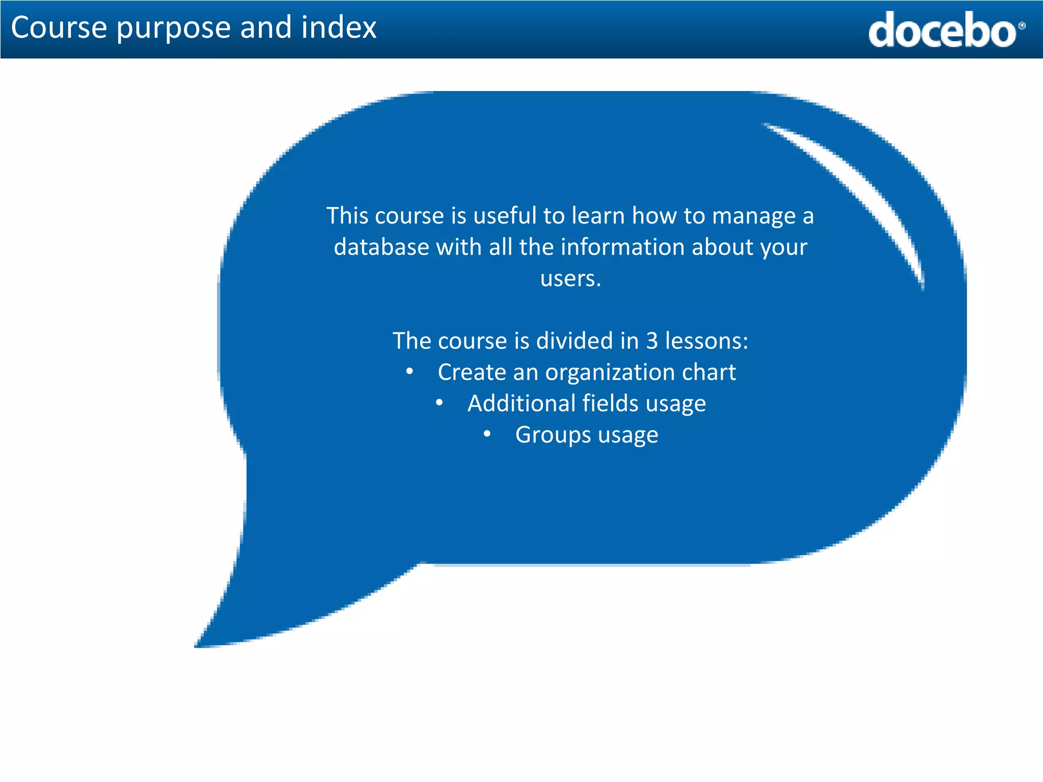 The course teaches users how to manage a user database using Docebo tools, specifically focusing on creating an organization chart. It covers three main lessons: creating the chart, using additional fields, and managing groups. Users can create nodes, assign them to users, and import user data from CSV files.