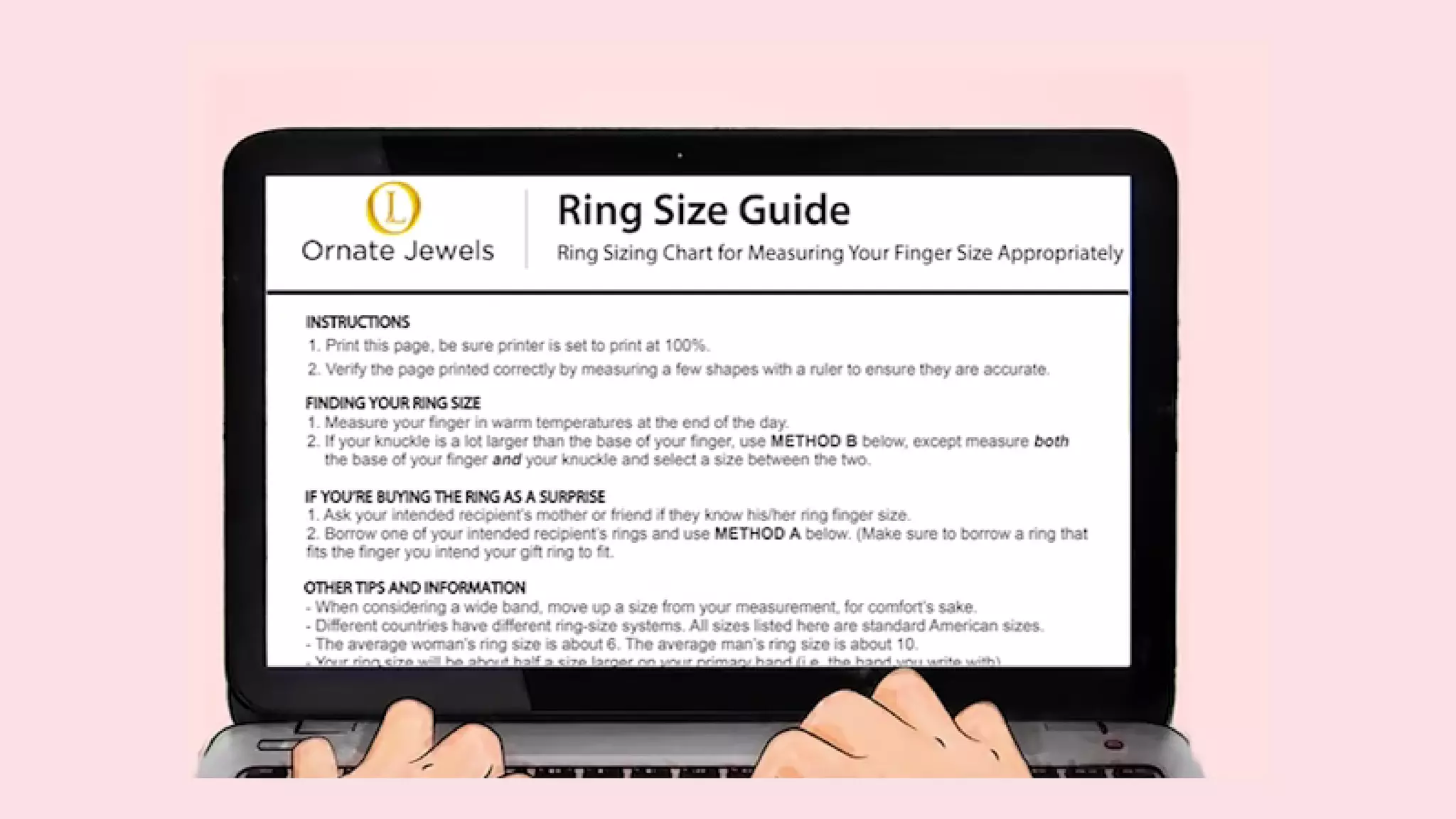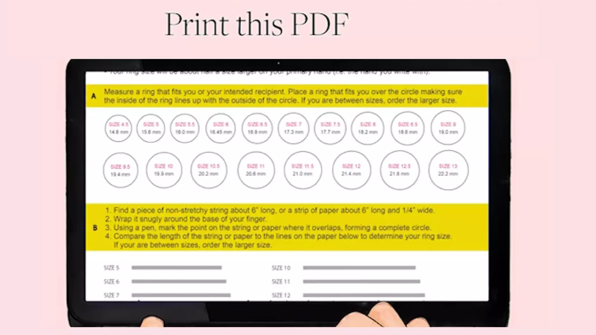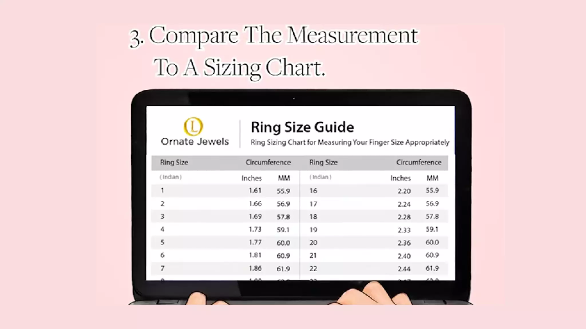 To measure your ring size, wrap a piece of string or ribbon around your ring finger and mark it. Then lay the string flat on a ruler to determine your ring size in millimeters or US size. If unsure of your size, contact a jeweler for assistance in properly measuring your finger.