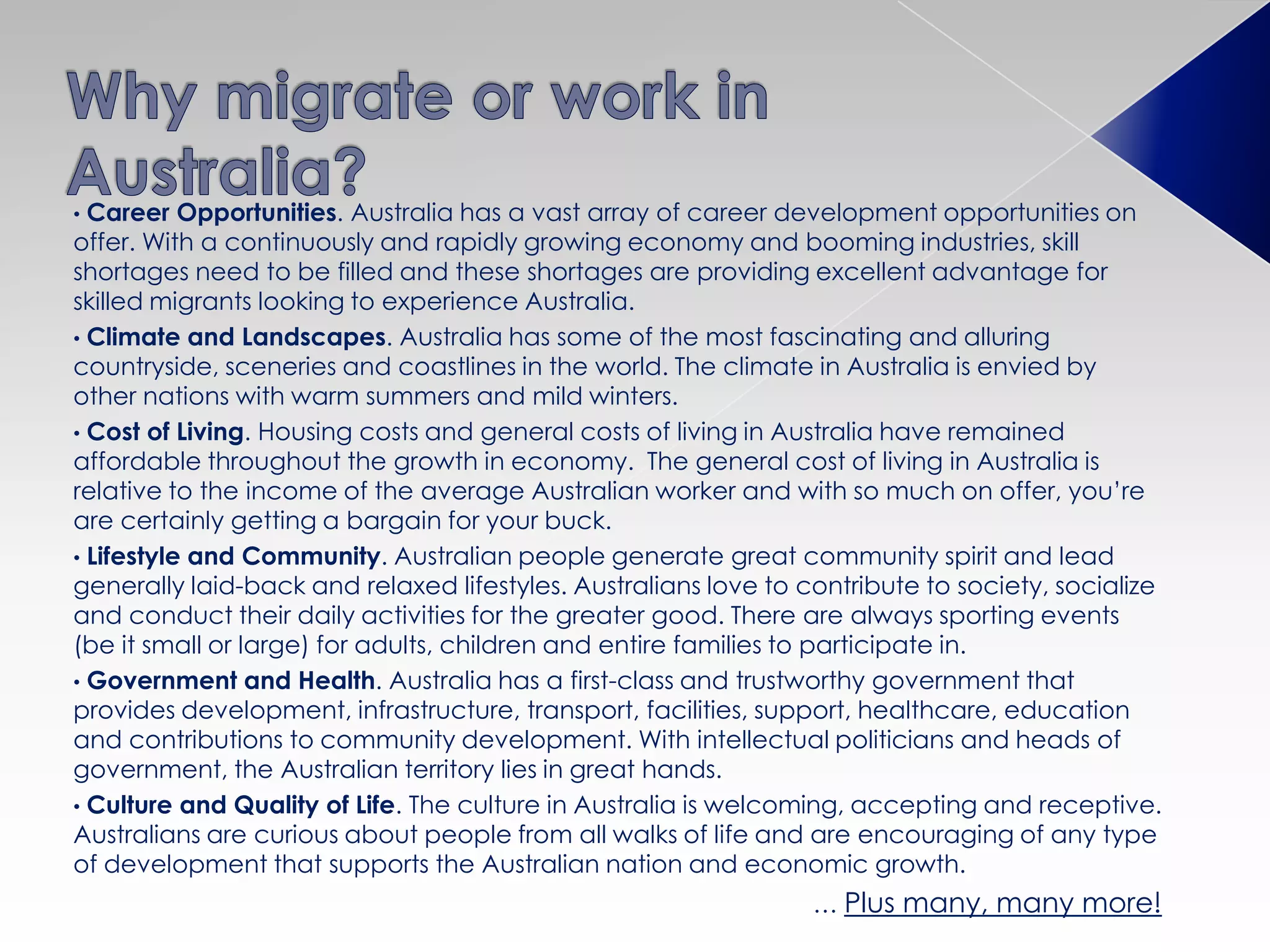 The document provides information about career opportunities, lifestyle, costs of living, education, and visa options in Australia. It discusses Australia's growing economy and job market, affordable cost of living, welcoming culture and communities, high-quality education system, and pathways to permanent residency such as skilled worker and student visas. Requirements for different visa subclasses are outlined. Overall the document presents a positive picture of opportunities available to migrants in Australia.