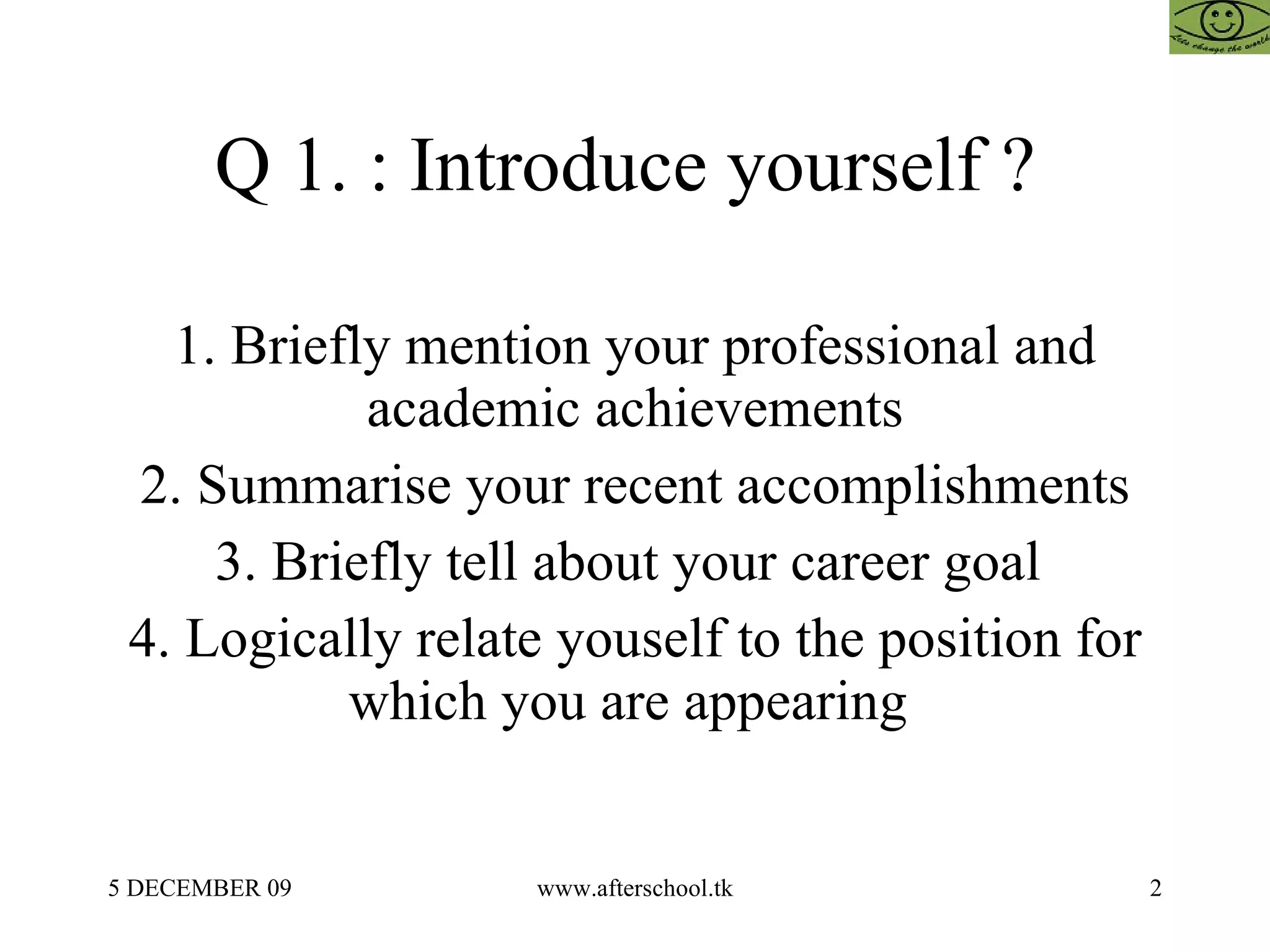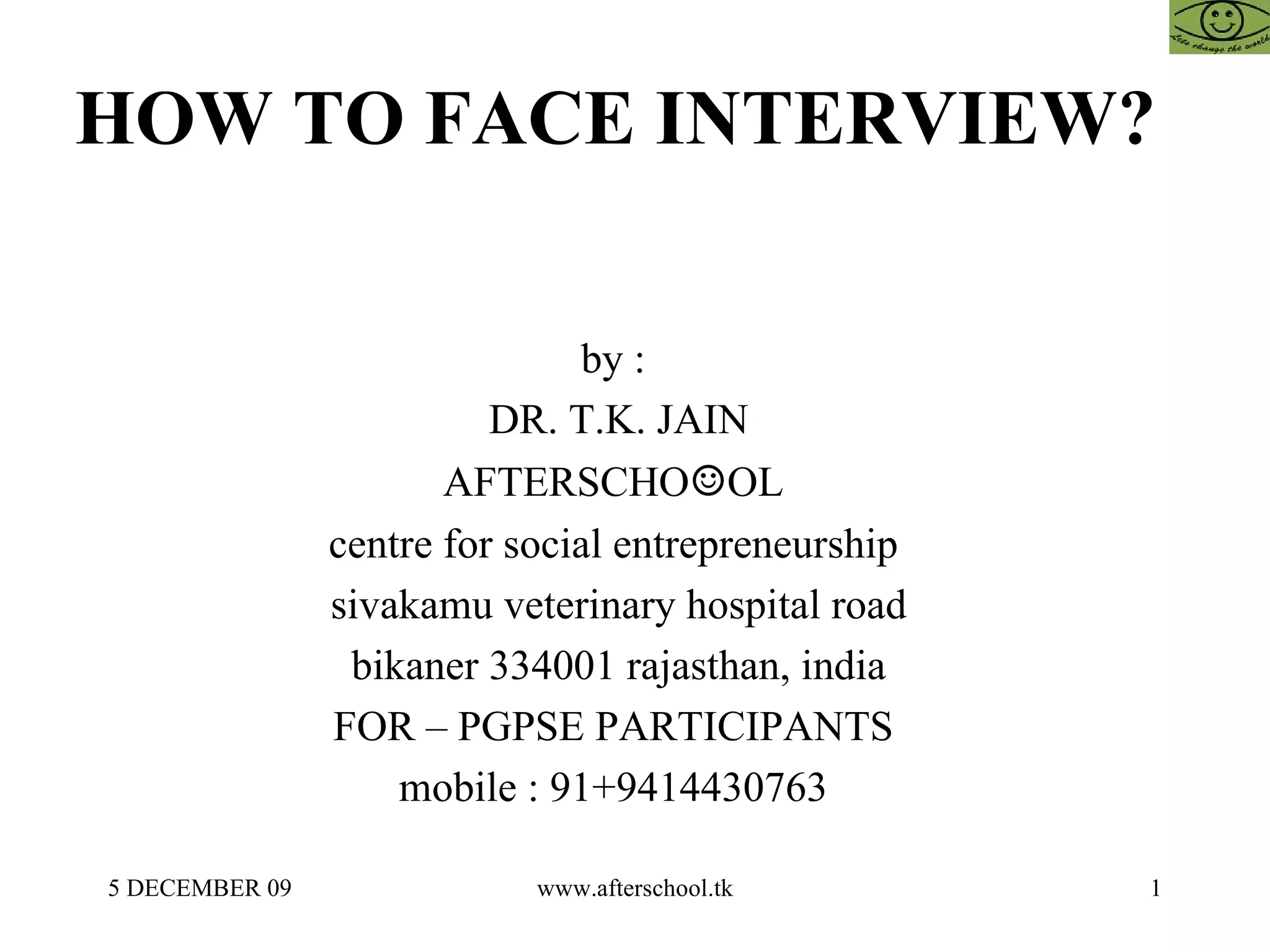 This document provides tips for facing an interview. It discusses introducing yourself by mentioning achievements and career goals. When asked why you want the job, relate your strengths to the position's requirements. For salary questions, avoid giving a number first and learn negotiation skills. Be flexible about relocation. Join at a practical time after learning company terms. Praise not criticize past employers and give credit to others for your achievements. Collect company information after politely asking specific questions. Study the company, job description, and bring credentials. Maintain positive body language and attitude. Avoid jobs that are unethical or painful. Join learning organizations for long-term career growth, not just money. Get permission before giving references.