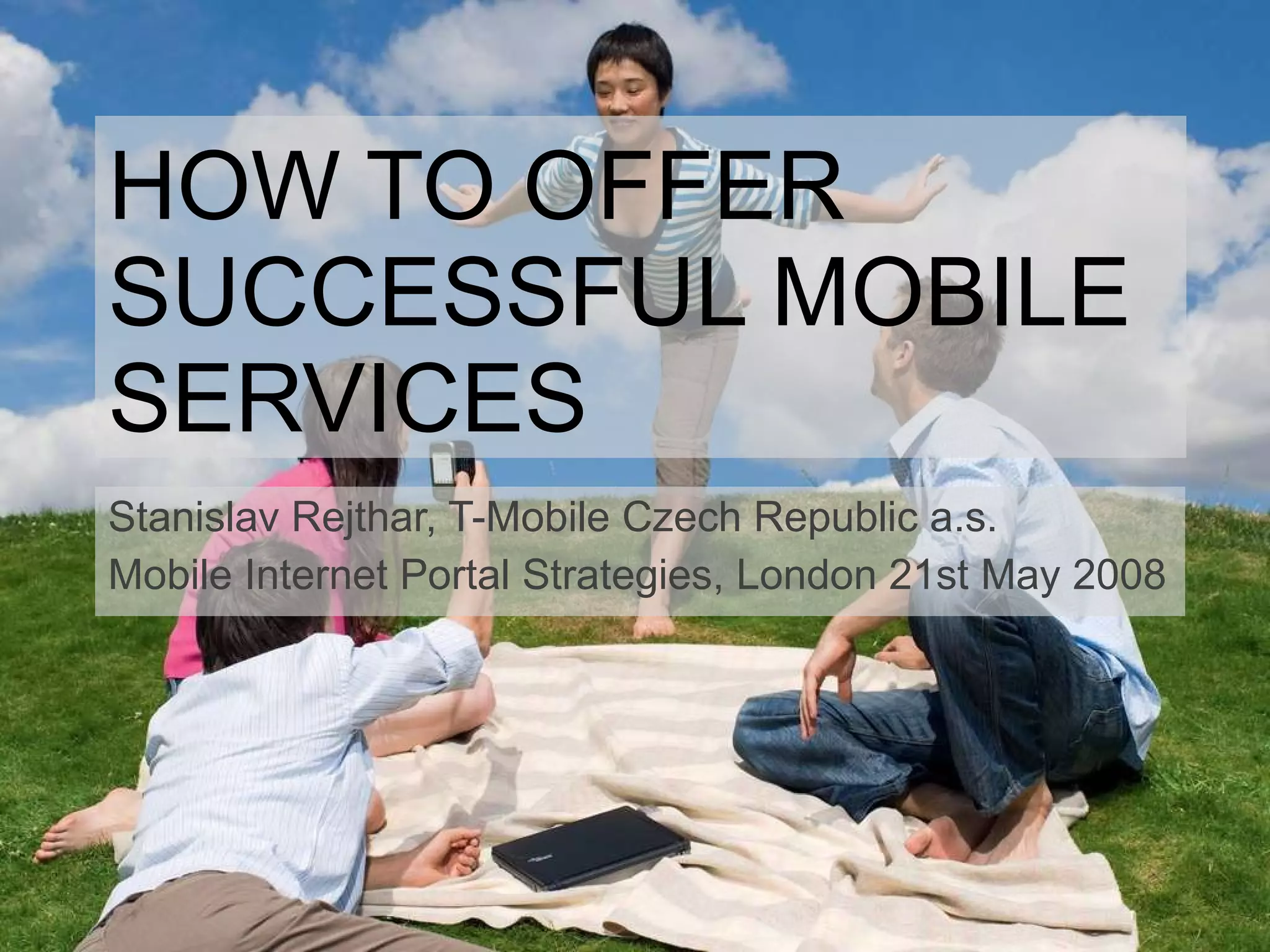 The document discusses how to offer successful mobile services. It emphasizes focusing on the customer experience, usability testing services on real devices, and enabling personalization. It also stresses the importance of partnerships within the mobile ecosystem and ensuring services are compatible with partners' business models. The key is to get the first customer visit right, ask for feedback, make services fast and easy to use on mobile, and test extensively on actual devices.