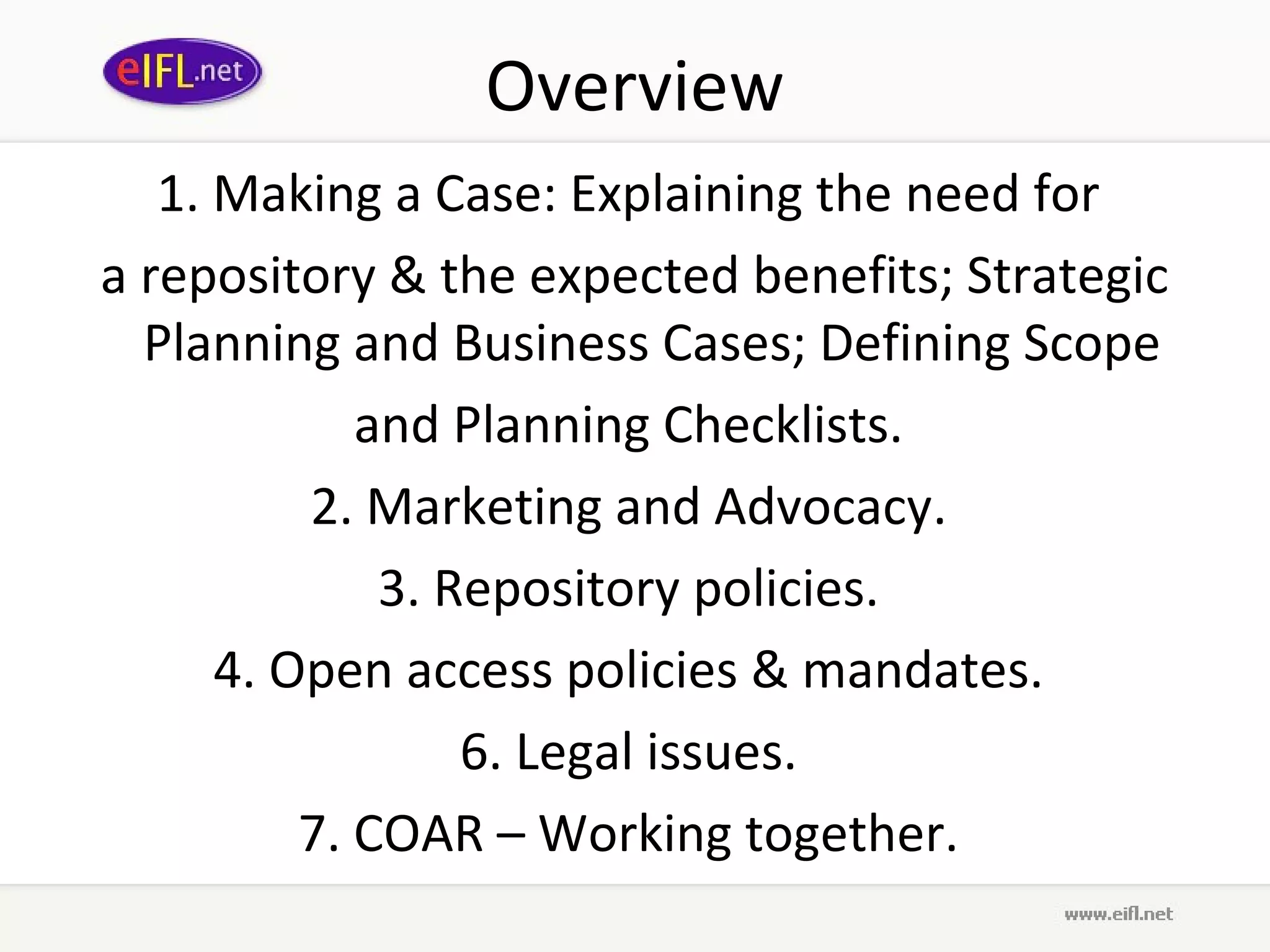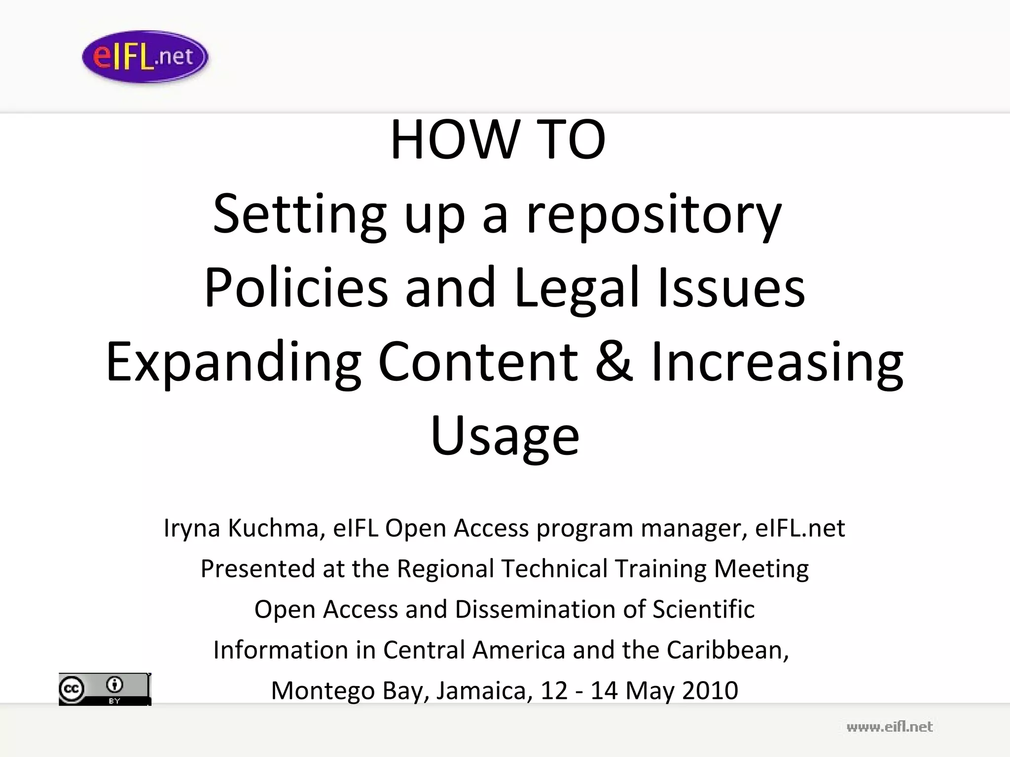 The document provides a comprehensive guide for establishing institutional repositories, covering aspects such as planning, advocacy, policies, and legal considerations. It emphasizes the importance of increasing access to research outputs, marketing strategies, and sustainability for repositories in developing and transition countries. Key objectives include coordinating open access policies, enhancing visibility of research, and engaging stakeholders in the repository's implementation and management.