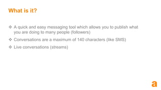 The document outlines a strategy for optimizing Twitter use for business, emphasizing the importance of defining a unique selling proposition, engaging with relevant audiences, and maintaining an authentic tone. It provides a structured approach to engagement, time management, and content creation, along with various tools and resources for effective Twitter management. The key takeaway is to utilize Twitter for meaningful interactions rather than overt selling while leveraging statistical insights for enhanced visibility.