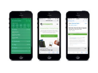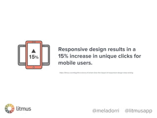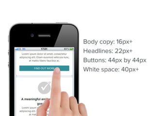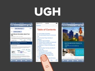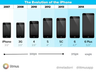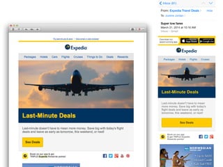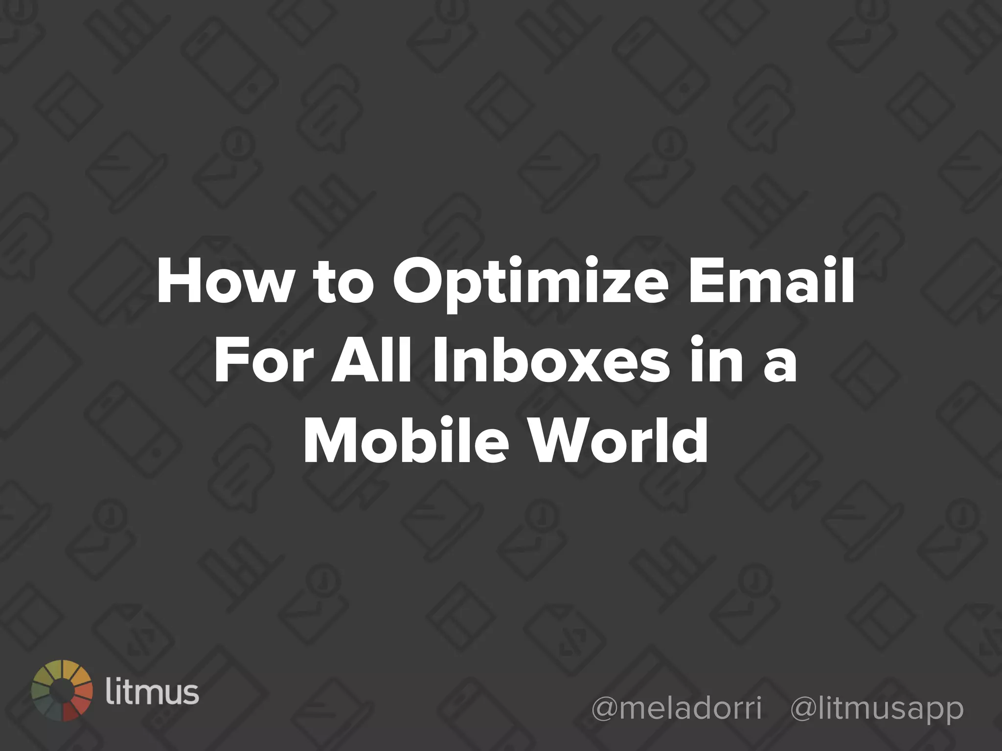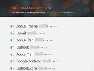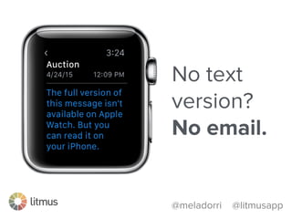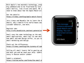 This document discusses optimizing emails for mobile devices. It notes that mobile email has grown 500% since 2011 and that 80% of subscribers delete emails that look bad on phones. It advocates for a mobile-first "any inbox, any device" strategy and discusses responsive, fluid, and mobile-first design approaches. It provides tips for mobile optimization like using large headlines, buttons, and whitespace as well as considering the Apple Watch which only shows plain text.