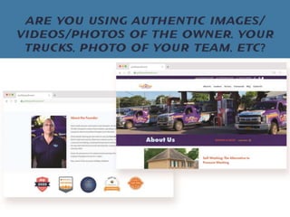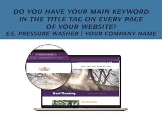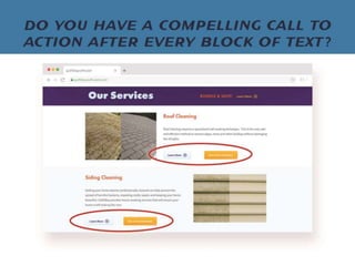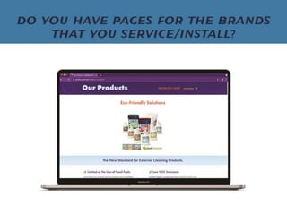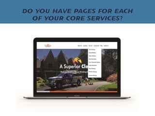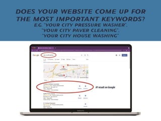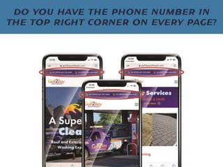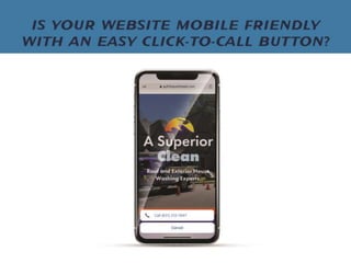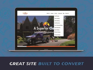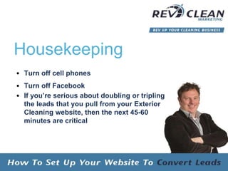 The document discusses how exterior cleaning business owners can improve their website conversions and leads. It emphasizes that the website should be the hub for generating leads and that businesses need to focus on converting visitors through calls-to-action, mobile optimization, and implementing marketing automation for follow ups in order to book more jobs. Customizing the website experience for the ideal customer avatar who is typically a busy homeowner can help increase revenues.