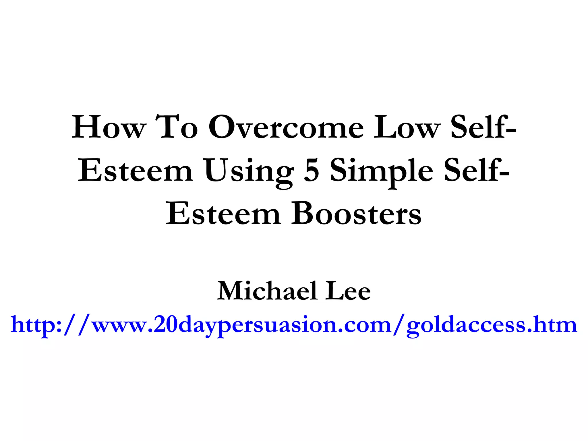 The document outlines five strategies to overcome low self-esteem, emphasizing the importance of support and self-reflection. Suggested methods include joining clubs for social interaction, seeking support from friends, and creating a list of personal qualities. Additionally, it encourages readers to embrace experiences and to read self-help books for further motivation and guidance.