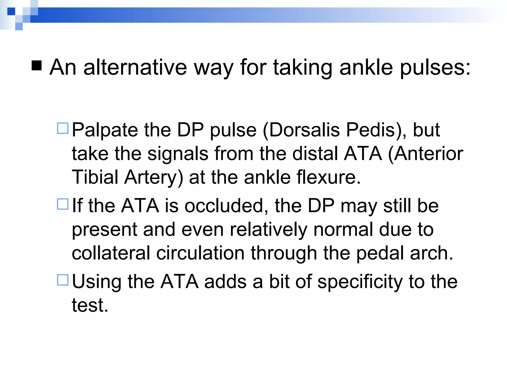 1) Taking ankle pressures using the dorsalis pedis pulse or the anterior tibial artery at the ankle adds specificity to ABI testing.