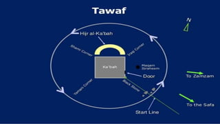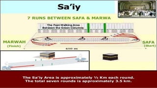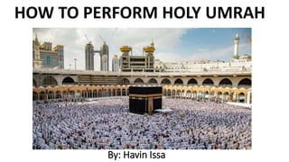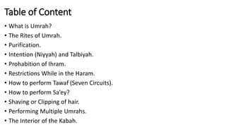 The document provides instructions for performing the rites of Umrah, a pilgrimage to Mecca that can be undertaken at any time. It outlines the steps which include purification, stating the intention to perform Umrah and reciting Talbiyah, entering a state of Ihram with associated prohibitions, performing Tawaf around the Kaaba and Sa'ey between Safa and Marwah hills, and shaving or clipping hair upon completion. Umrah cleanses the soul from sins and is an expiation for sins committed between Umrahs. The document instructs both men and women on the proper rituals and prohibitions during Umrah.