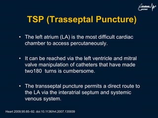 The document discusses the history and technique of transseptal puncture (TSP). It describes how TSP provides direct access to the left atrium and has become a routine skill for electrophysiologists performing procedures like atrial fibrillation ablation. The technique involves using a Brockenbrough needle and Mullins sheath inserted via the femoral or jugular vein to puncture the interatrial septum, usually at the fossa ovalis. Landmarks, equipment, steps of the procedure, challenges, and complications are reviewed in detail. The summary emphasizes the importance and increasing use of TSP as well as reviews key aspects of the technique and potential complications.