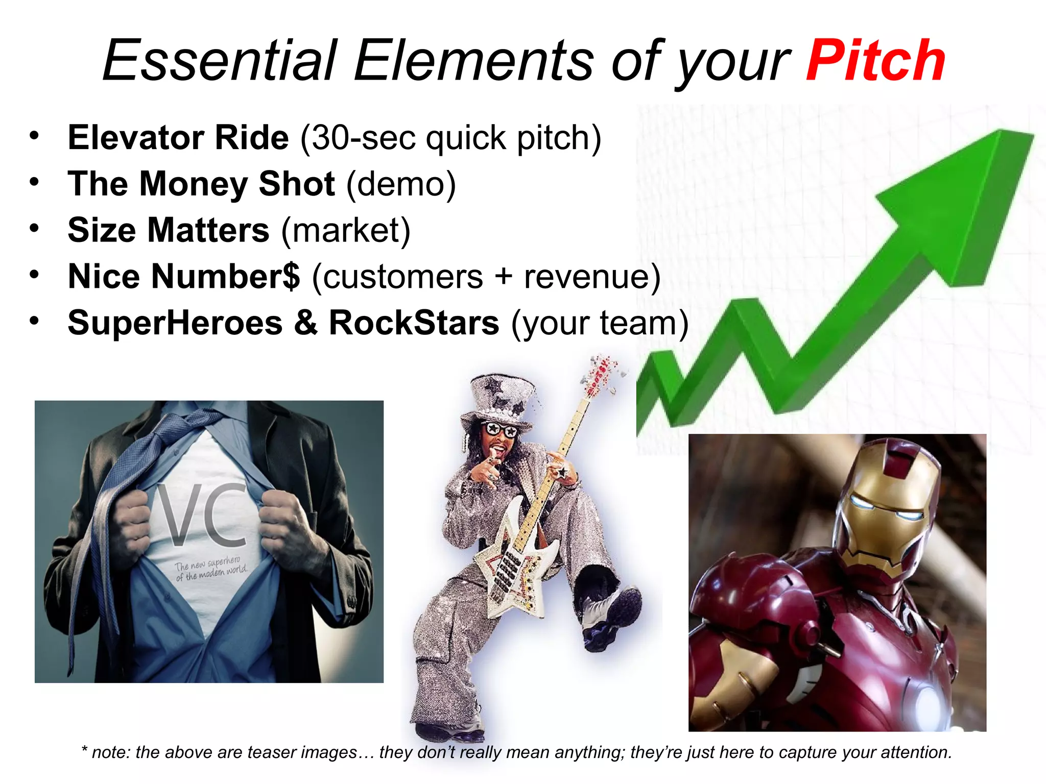 This document provides guidance on pitching startups to venture capitalists (VCs). It recommends including the following in a pitch: a 30-second elevator pitch, a product demo or "money shot", information on the market size and potential, revenue models, proprietary technology, competition, marketing plans, the founding team, and how funding would be used and what milestones it would help achieve. The document emphasizes keeping the pitch brief, memorable, and focused on problems, solutions, and business metrics rather than jargon or projections. It also stresses the importance of practicing and being prepared to demo the product successfully.