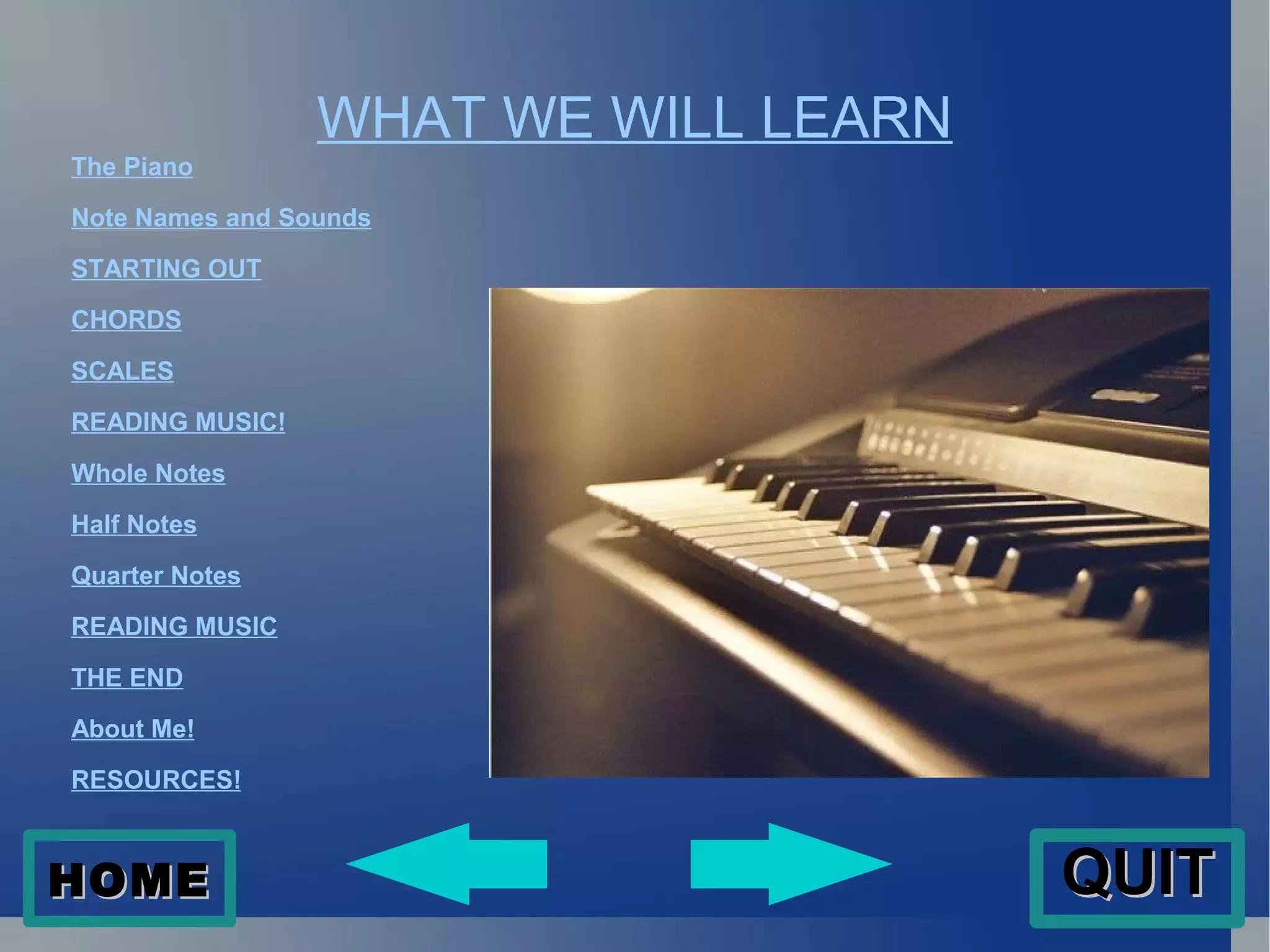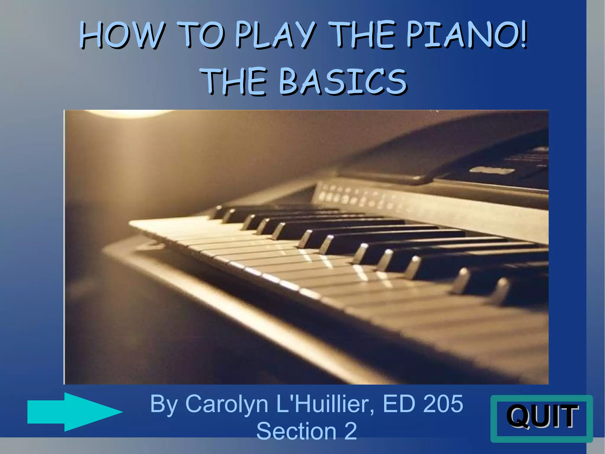 The document provides a beginner's guide to playing the piano, covering fundamental concepts such as piano note names, sounds, chords, scales, and reading music. It explains the significance of different note values like whole, half, and quarter notes, and introduces the treble and bass clefs. Additionally, it offers resources for further learning and concludes with a personal note from the author, Carolyn L'Huillier.