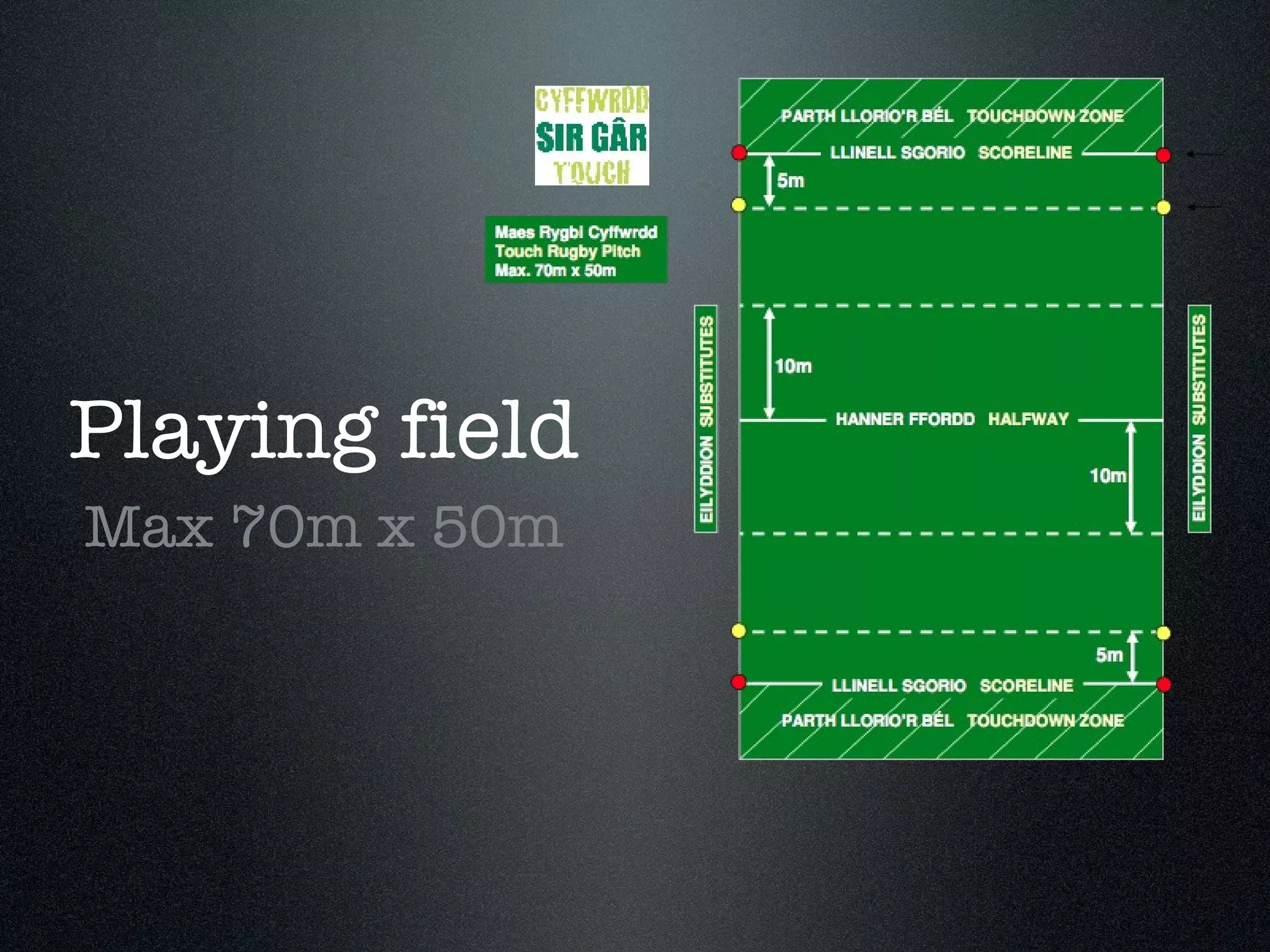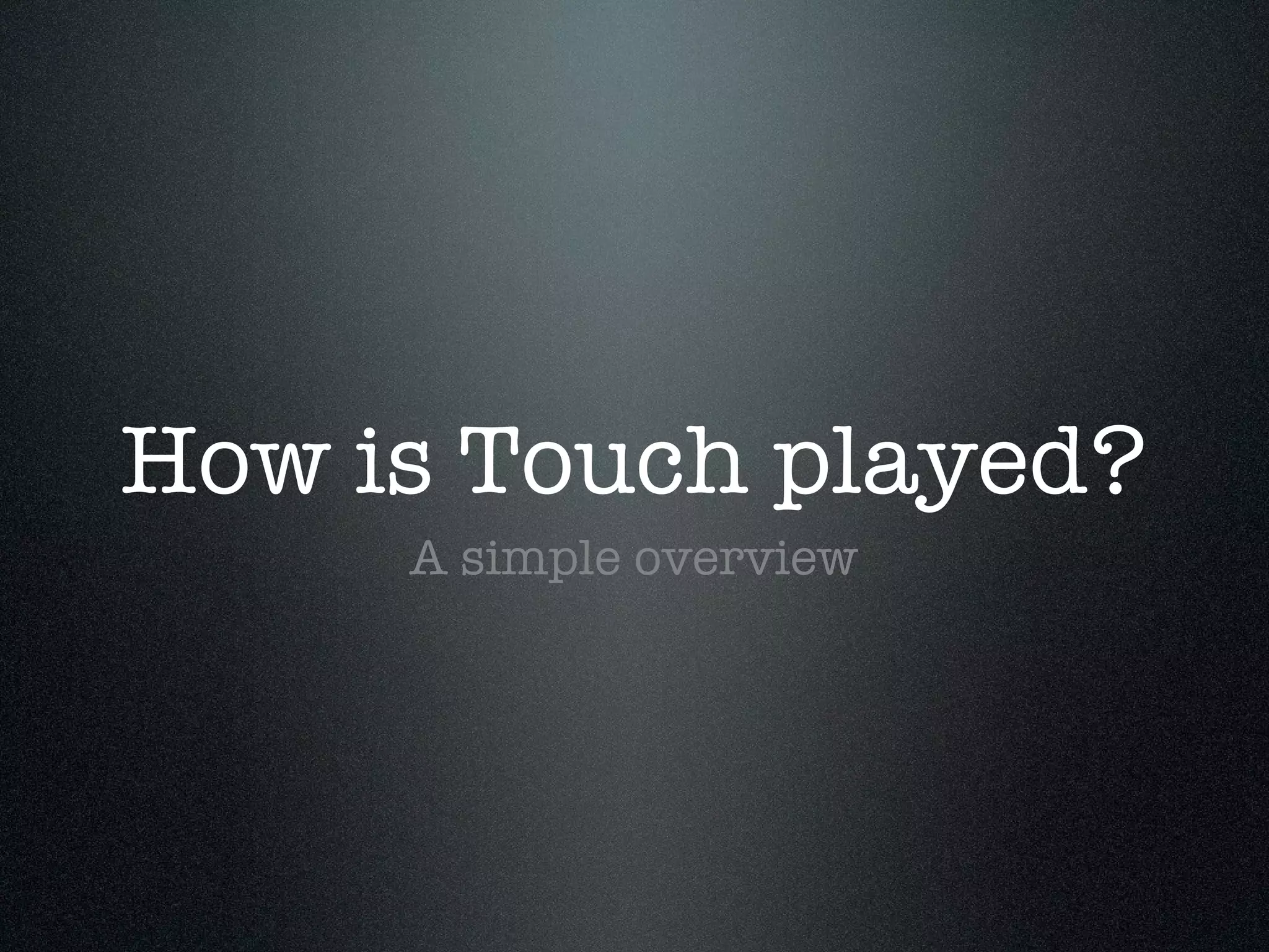Touch is a 6-a-side game played on a pitch of 70m by 50m where teams have 6 attempts to score before turning over possession. After a player is touched by the opposition, they must immediately perform a rollball where they roll the ball between their feet for a teammate, known as the 'Half', to pick up. The 'Half' can then run with the ball or pass it to continue attacking. Teams score by placing the ball on or over the scoreline for 1 point.