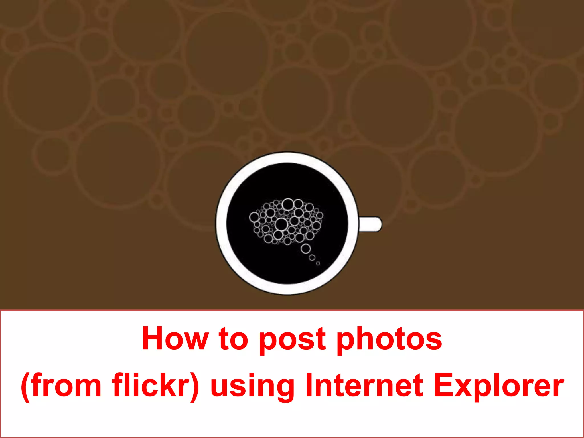 To post photos from Flickr using Internet Explorer, click on the picture properties, copy the photo by pressing Ctrl+C, add a description, and paste the photo by pressing Ctrl+V.