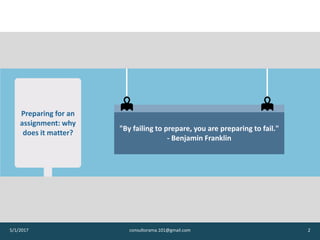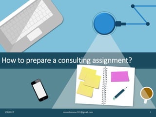 The document provides guidance on preparing for a consulting assignment. It discusses why preparation is important, the key tasks involved in preparation including finalizing the team mix, preparing field work, taking care of logistics, and gathering information. It emphasizes that the engagement manager plays a key role in preparation by overseeing tasks like logistics, information gathering, and field work preparation. Preparation helps avoid issues like missed deadlines or poor quality by ensuring the team is ready on day one.
