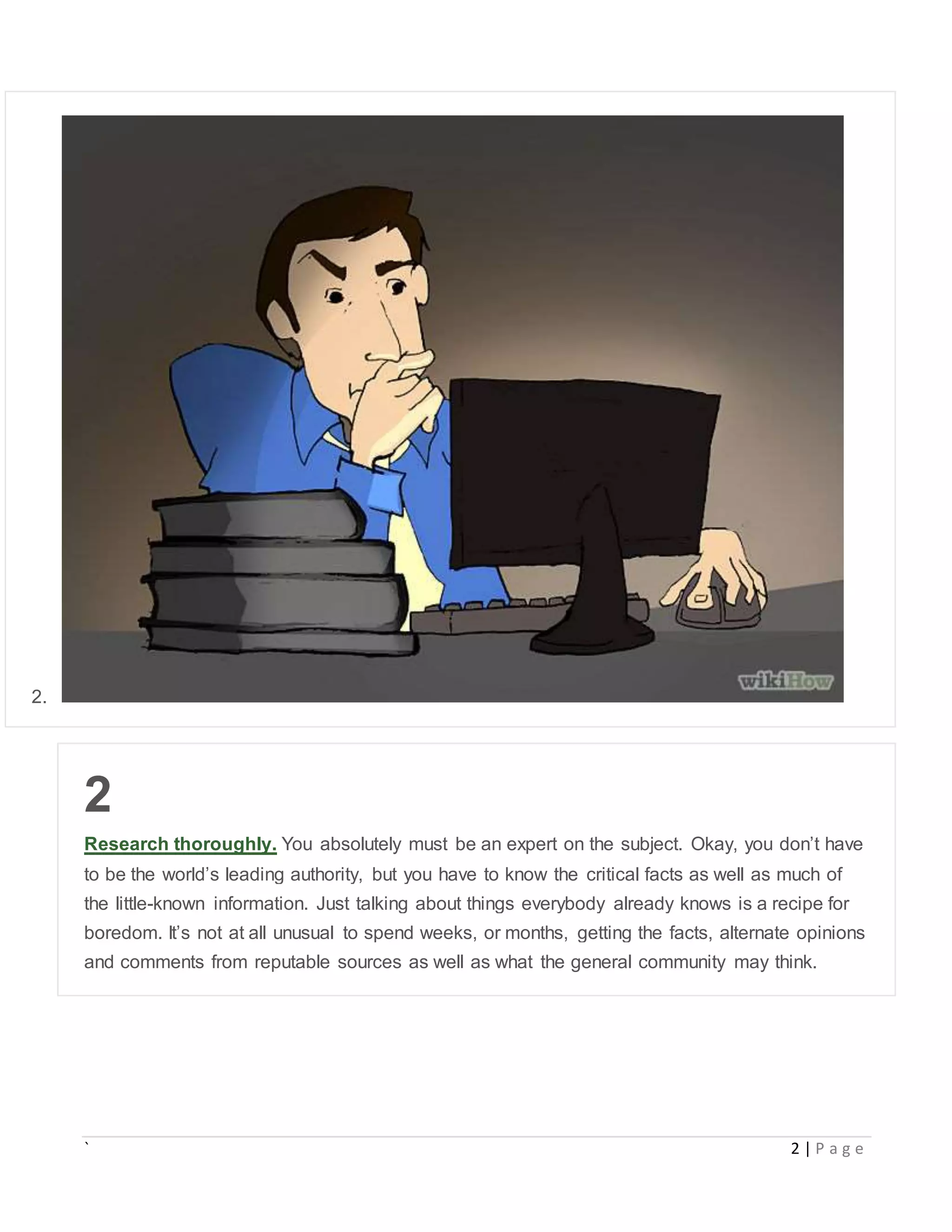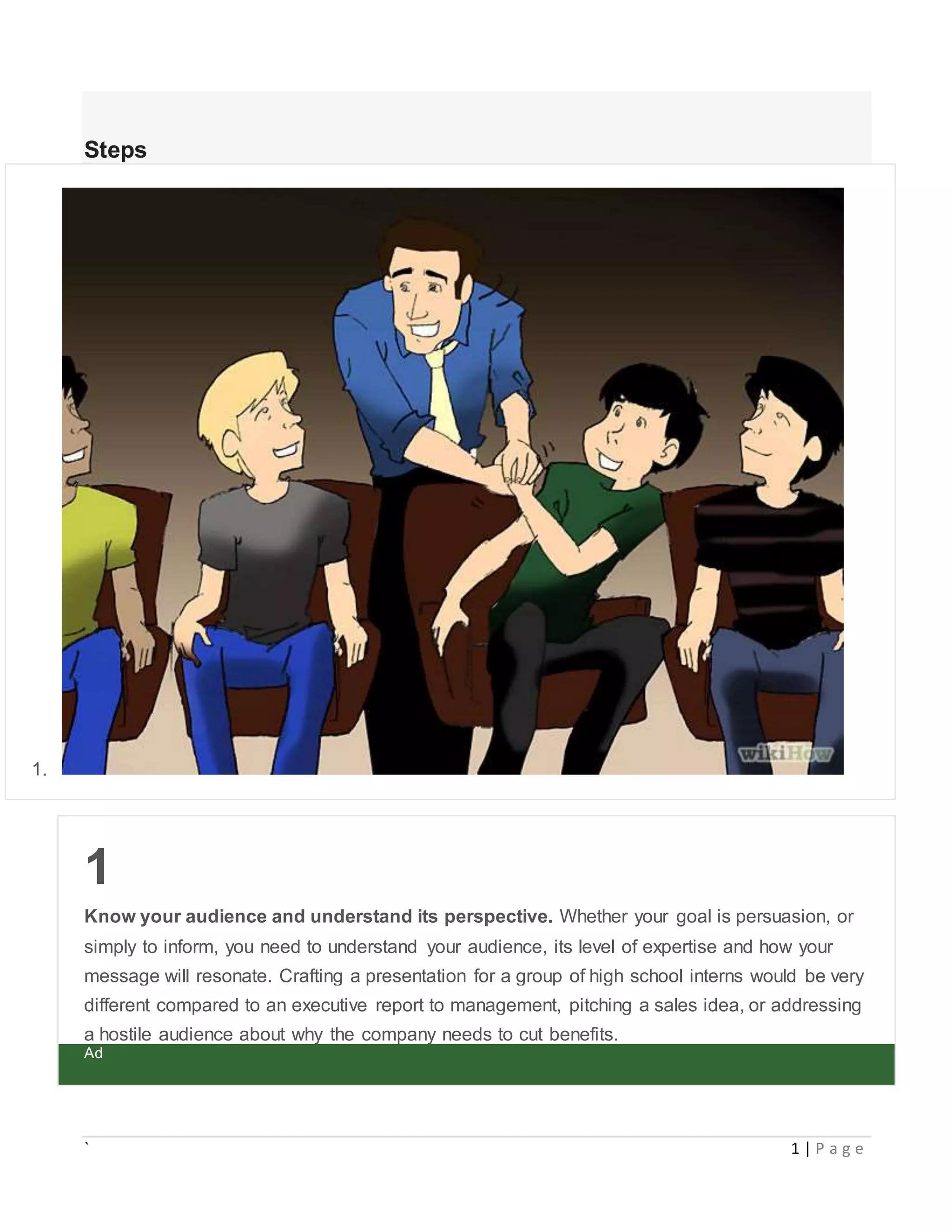 The document provides a 12-step process for preparing and delivering an effective presentation: 1) Know your audience, 2) Research thoroughly, 3) Document sources, 4) Write the speech, 5) Prepare visual aids, 6) Rehearse alone, 7) Do a dress rehearsal with feedback, 8) Tweak based on feedback, 9) Prepare yourself mentally, 10) Introduce and present the material, 11) Take questions, and 12) Conclude thanking the audience. Additional tips are provided for small group settings, including facilitating discussion and maintaining audience focus. Warnings are given such as not distributing materials in advance or overusing filler words.