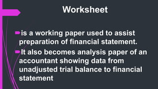 The document outlines the process of preparing a worksheet for financial statement preparation, detailing steps from entering headings to calculating adjusted trial balances. It includes guidance on recording unadjusted trial balance data, making necessary adjustments, and determining net income or loss. The example provided illustrates an adjusted trial balance for Sanchai Tan Beauty Salon as of January 31, 2012, with total debits and credits balanced at 215,764.