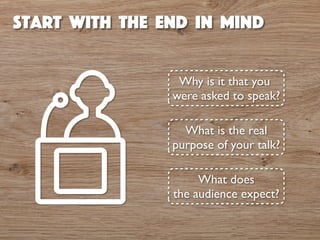 The document provides guidance on preparing for presentations by emphasizing the importance of understanding the audience and the purpose of the talk. It suggests keeping content simple and structured, focusing on three key takeaways, and using stories for engagement. Additionally, it highlights the necessity of rehearsal and confidence in delivery.