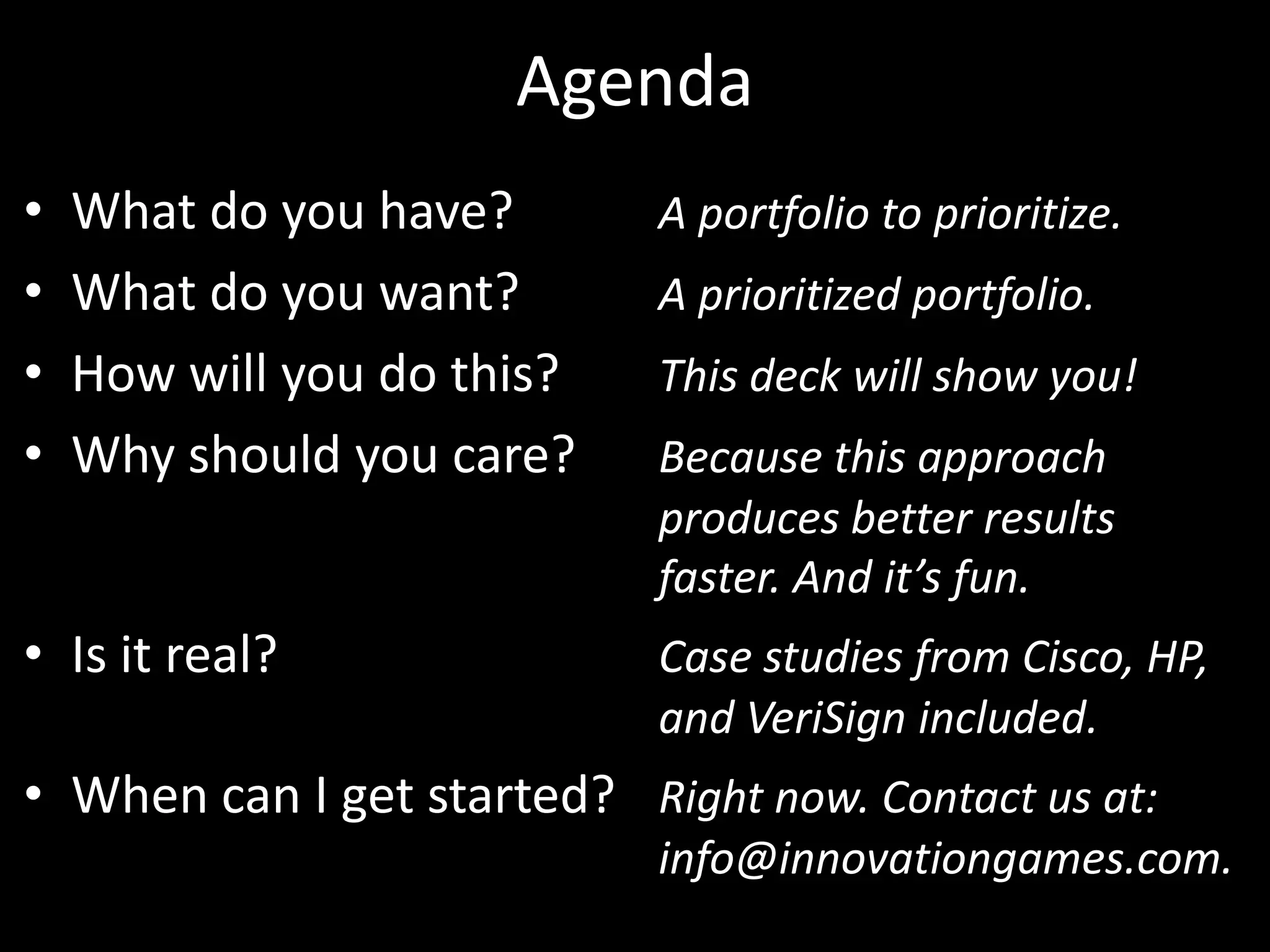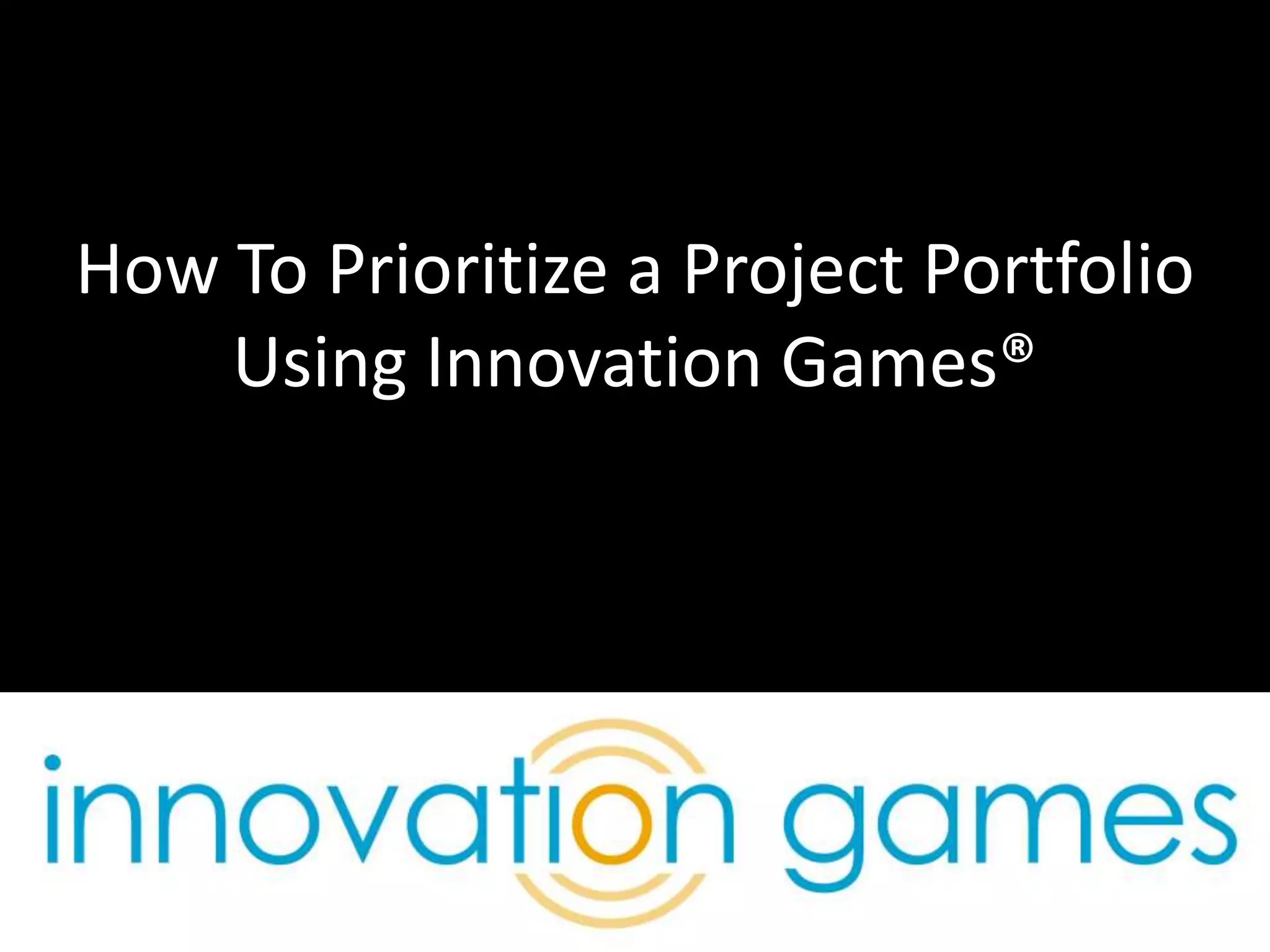 This document outlines a process for prioritizing a project portfolio using online games called Innovation Games. It involves gathering all potential projects, removing obvious non-starters, splitting projects into "run the business" and new projects. Projects are prepared for prioritization games. Games are used to prioritize the projects and confirm resource requirements match priorities. Case studies from Cisco, HP, and VeriSign show benefits include engaging global teams, reducing risk, and having fun.