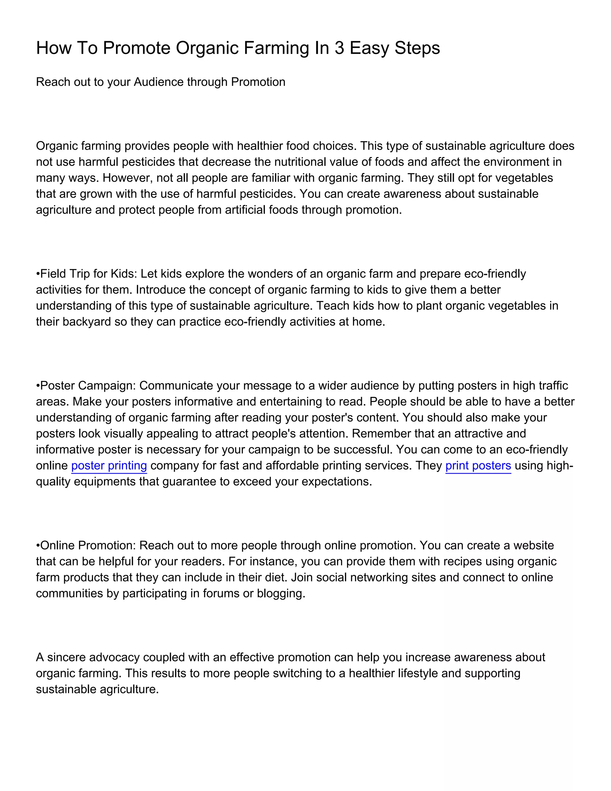 Organic farming provides healthier food choices without harmful pesticides. However, many people remain unfamiliar with organic farming. The document outlines 3 easy steps to promote organic farming: 1) Field trips to organic farms can educate children about sustainable agriculture practices. 2) Poster campaigns in high-traffic areas can raise awareness about organic farming using visually appealing and informative designs. 3) Online promotion through websites, social media, forums and blogs can reach broader audiences. Effective promotion can help advocate for organic farming and encourage healthier lifestyles.