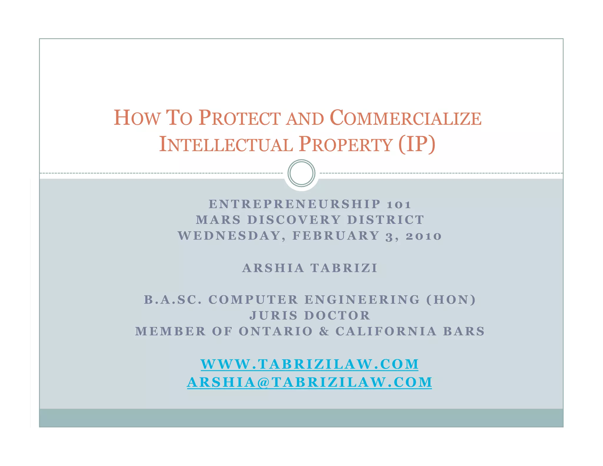 The document is a presentation about protecting and commercializing intellectual property given by Arshia Tabrizi, a lawyer. It discusses the different types of intellectual property including trade secrets, patents, copyrights, and trademarks. For each type of IP, it outlines how to obtain, maintain, and use legal protections for ideas and innovations. The presentation provides an overview of intellectual property for entrepreneurs and business owners.