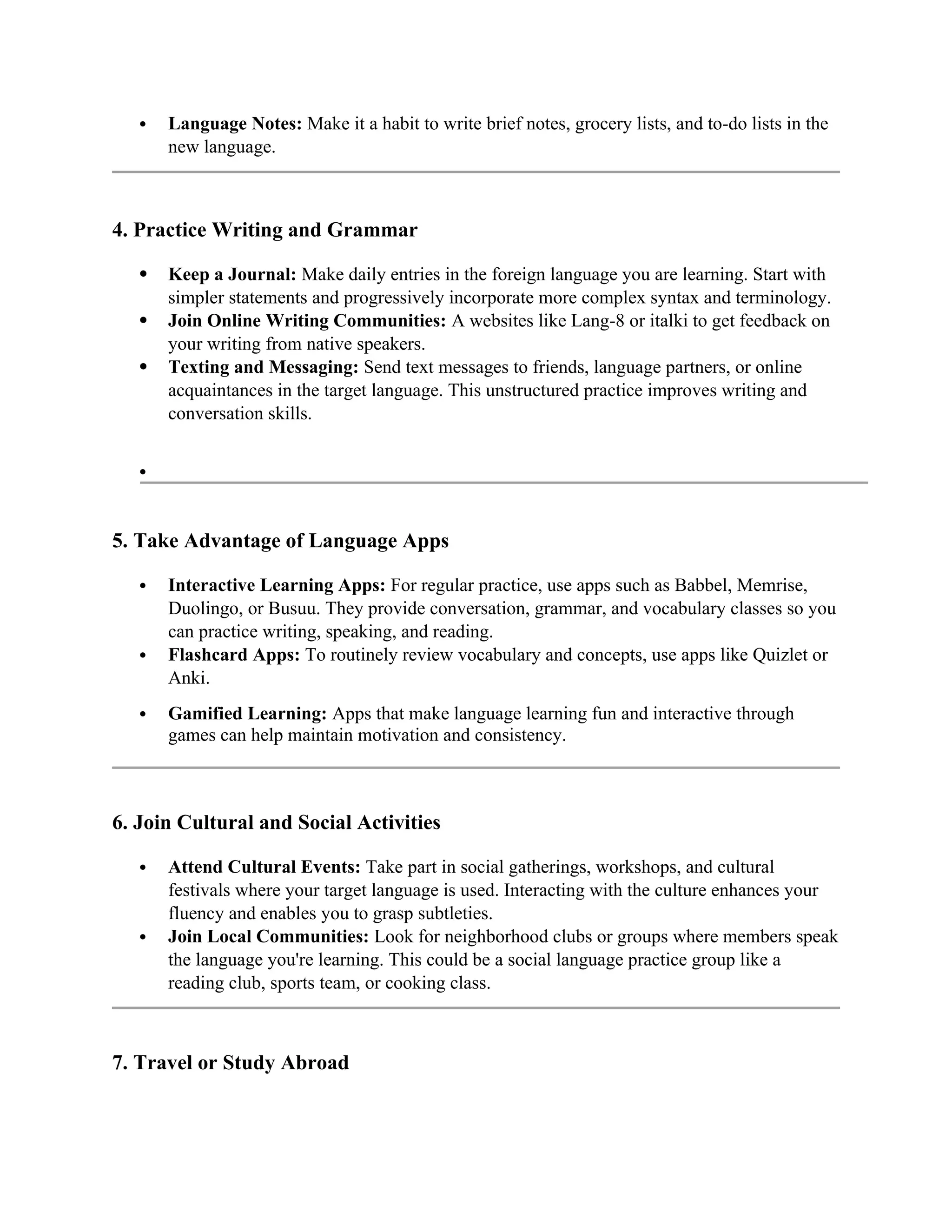 This comprehensive guide provides various methods to put a new language into practice, emphasizing daily speaking, immersion in media, and incorporating the language into daily activities. It suggests using language apps, engaging in cultural events, practicing with online communities, and setting specific learning challenges. The document also highlights the importance of seeking professional feedback and finding enjoyable ways to use the language for success in learning.