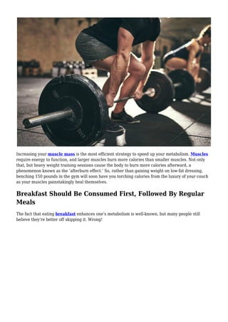 The document discusses various strategies to increase metabolism, emphasizing the importance of muscle mass and regular meal consumption, including breakfast. It suggests methods such as weight training, cold exposure, hydration, consuming spicy foods, cardio exercises, high protein intake, and caffeine consumption as effective ways to enhance metabolic rate. Additionally, it warns against sugar intake due to its negative effects on metabolism and insulin levels.
