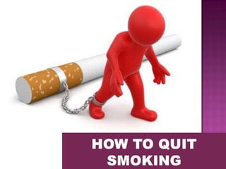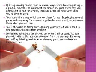 The document outlines various methods and strategies for quitting smoking, emphasizing the importance of personal choice and preparation. It discusses coping with cravings, withdrawal symptoms, and the need for support from family and professionals, as well as the role of exercise and distraction. The document also highlights the significance of setting goals and staying committed to the quitting process despite potential setbacks.