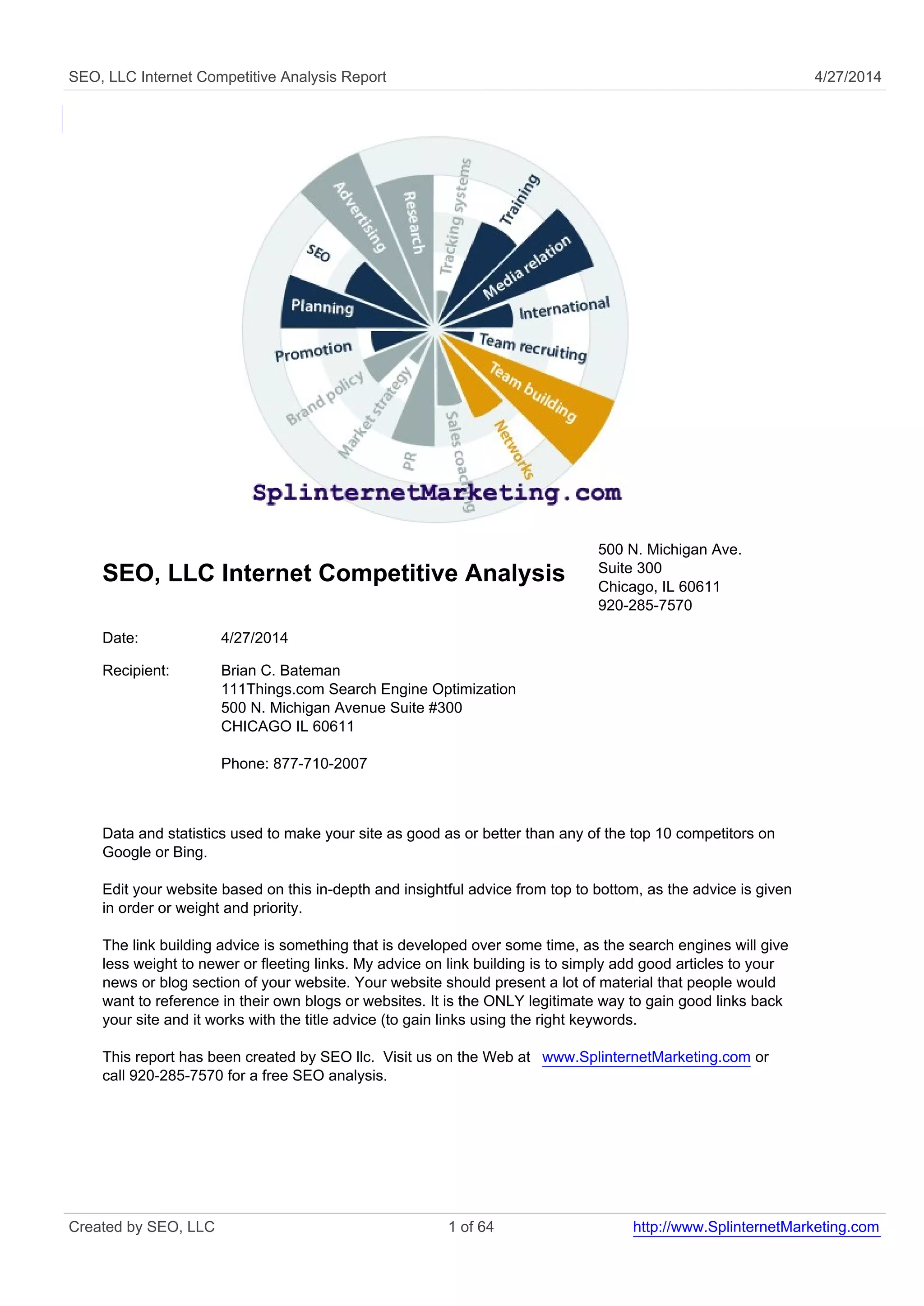 The document is a competitive analysis report by SEO LLC aimed at optimizing the website 111things.com for a better ranking in Google under the search term 'search engine optimization'. It provides insight into backlink strategies and keyword usage, emphasizing the importance of quality content for acquiring legitimate links. The report details weaknesses in the site's SEO performance, noting it only meets 63% of the top ranking requirements for the specified search term.