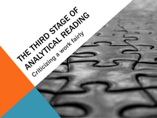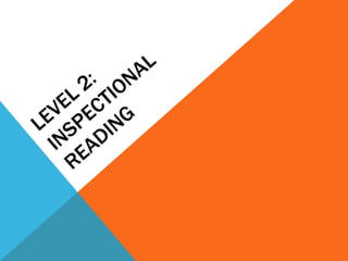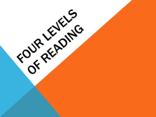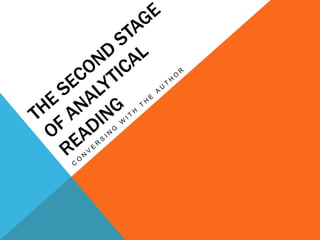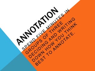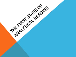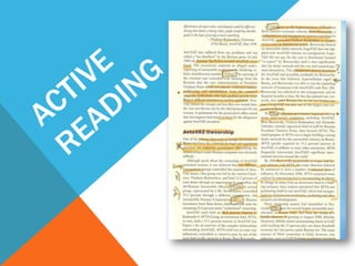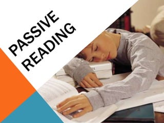 The document discusses the importance of active reading over passive reading. It outlines four basic questions readers should ask themselves while reading - what is the overall theme, what are the key details and arguments, is the information true, and what is the significance. It also provides tips for annotating books, such as underlining, writing notes, and numbering or lettering points. The essence is that reading is an active conversation where the reader engages critically with the text.