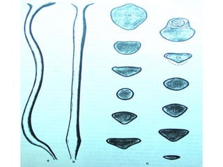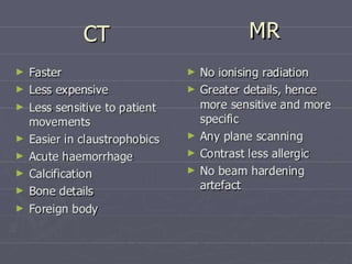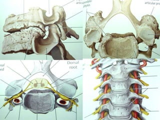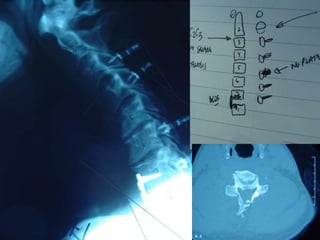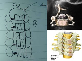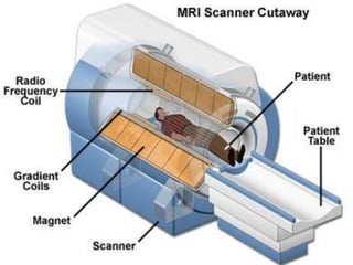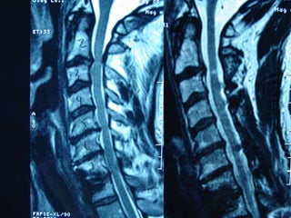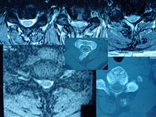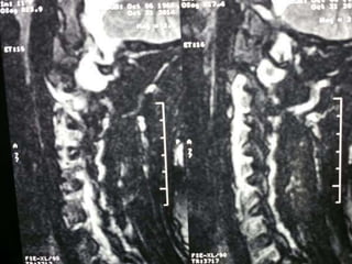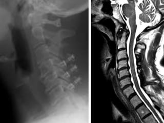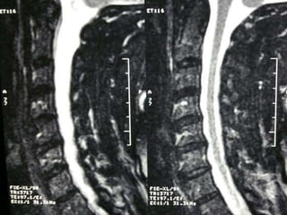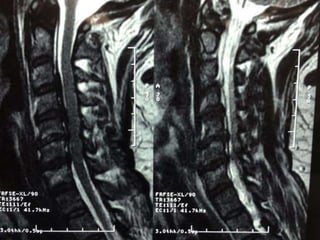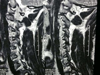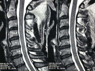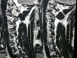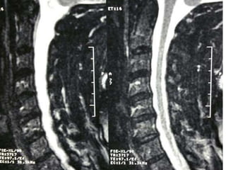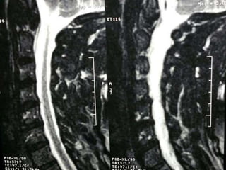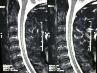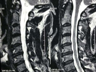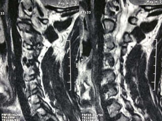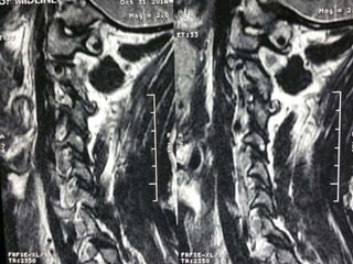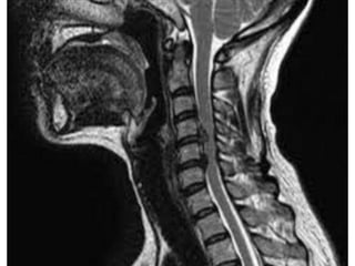 This document provides information on how to read a cervical MRI. It begins with background on MRI equipment such as the magnet, gradient coil, and RF coil. It then discusses the anatomy of intervertebral disks and how degeneration appears on MRI. The remainder of the document reviews several patient case examples, noting relevant imaging findings and clinical histories. Key details like disc height, spinal cord measurements, prior surgeries, and symptoms are highlighted for each case. A brief history of MRI development is also included, mentioning early pioneers like Damadian, Lauterbur, and Mansfield.