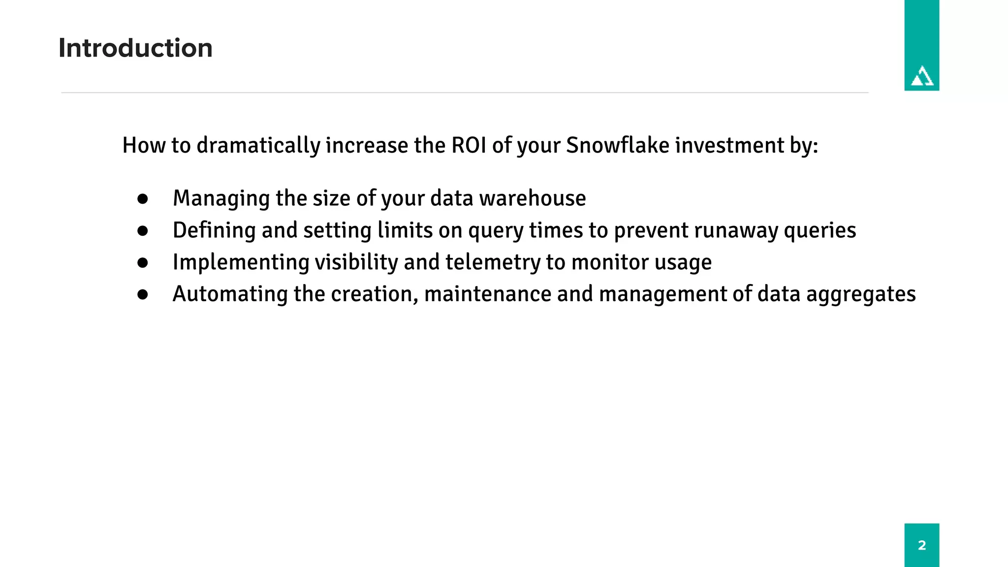 The document discusses strategies to achieve a 270% return on investment with Snowflake by optimizing data warehouse management, query performance, and resource allocation. Key points include the importance of visibility, telemetry for monitoring usage, and leveraging automation for data processing. It highlights the roles of industry experts and presents performance benchmarks demonstrating the effectiveness of these strategies.