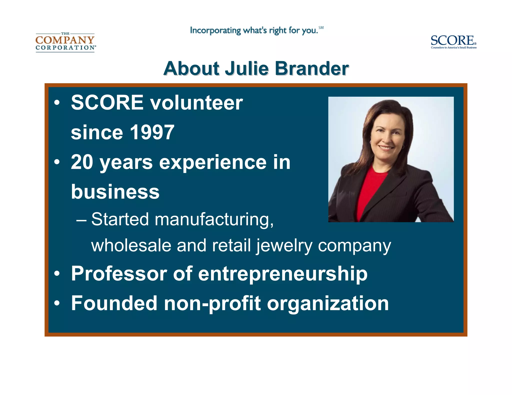 This document provides guidance on starting a new business from experts Julie Brander and Steve Bloom. It outlines key steps like developing an effective elevator pitch and mission statement, testing the business idea through market research, protecting the idea with patents or trademarks, choosing an appropriate legal structure like an LLC or incorporation, securing funding, building a team, and creating a business plan to chart progress. Resources from SCORE and The Company Corporation are provided to help new entrepreneurs.