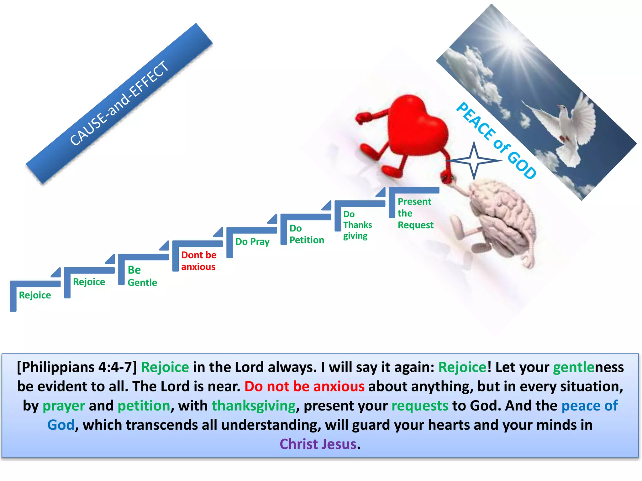 The document encourages the reader to rejoice, be gentle, and not anxious. It advises to pray, give thanks, and present requests to God in every situation. Doing this will allow the peace of God to guard one's heart and mind in Christ.